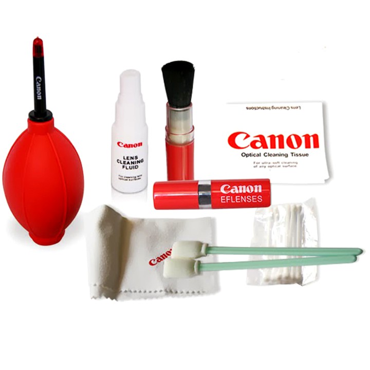Bộ vệ sinh máy ảnh Canon (Cleaning Kit) gồm bóng thổi, chổi mềm lau ko gây xước, dung dịch vệ sinh, khăn lau… giúp bạn giữ thiết bị luôn sạch sẽ. Các bước vệ sinh : 1- Tháo kính lọc. 2 - Sử dụng bóng tạo áp lực để thổi bay các hạt bụi 3 - Quét sạch bụi bẩn bằng cọ m