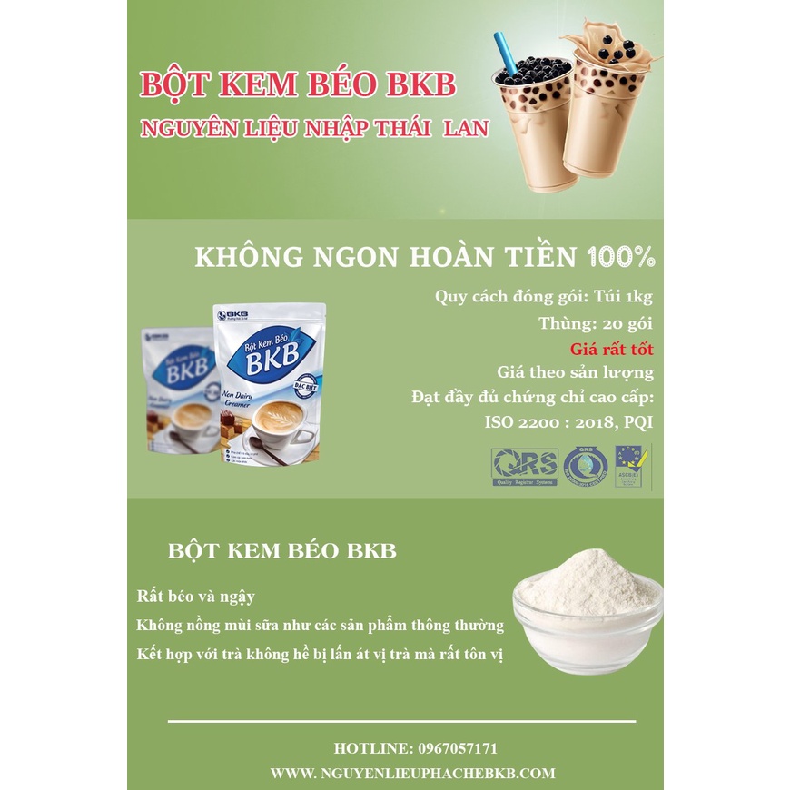 Bột Kem Béo Nguyên Liệu Làm Trà Sữa Trân Châu BKB gói 1KG Bột kem béo BKB hội tụ đầy đủ thơm, béo, ngậy mà ko át đi vị trà! Đảm bảo an toàn về chất lượng và sức khoẻ luôn ạ! Sản phẩm kem béo BKB khác biệt, thơm ngon, béo ngậy Mỗi cốc 500ml dùng 20-30gr bột sữa #botk