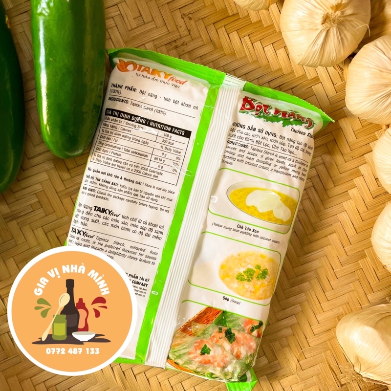 Loại bột Bột năng Khối lượng Thành phần Bột năng được tinh chế từ củ khoai mì (còn được gọi là tinh bột khoai mì) Công dụng Dùng để tạo độ sánh cho các món xào, soup. Tạo độ dai cho các món bánh Cách dùng Lượng dùng tuỳ mục đích sử dụng Bảo quản Để nơi khô ráo, thoáng mát, tránh ánh nắng trực tiếp Thương hiệu Tài Ký (Việt Nam) Nơi sản xuất Việt Nam HSD:12 tháng Gia vị nhà Mình ------------------------------------------ -------- 👉Chuyên cung cấp gia vị Hoa,Việt,cho các quán ăn,nhà hàng,hàng tiêu dùng. 👉Giá cả phải chăng hợp túi tiền 👉Ship hàng qua các nhà xe,chành xe xuyên các tỉnh thành với số lượng lớn. 👉SĐT liên hệ:0772487133(gặp Thanh) Zalo liên hệ :0772487133(hỗ trợ 24/24)