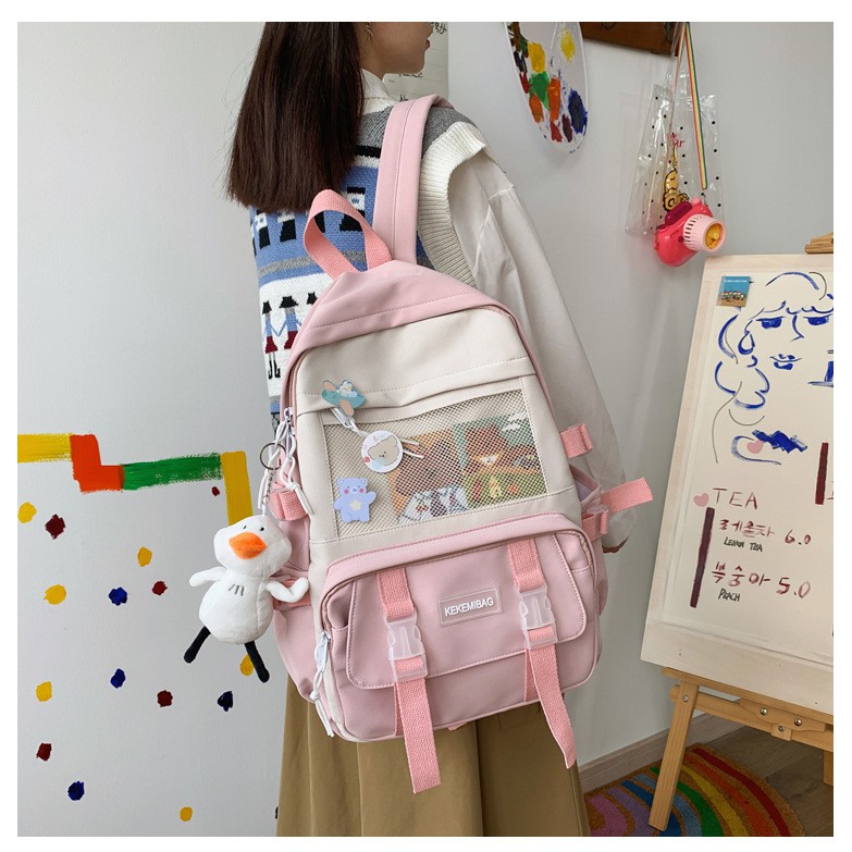 Balo ulzzang Hàn Quốc đi học tặng kèm phụ kiện Chất liệu: Vải CANVAS không thấm nước Mô tả sản phẩm: Balo nữ được thiết kế 1 ngăn chính to và nhiều ngăn phụ nhỏ, bên cạnh có 2 ngăn đựng chai nước Balo được may tỉ mỉ chắc chắn, không bạc màu theo thời gian. Khóa kéo c