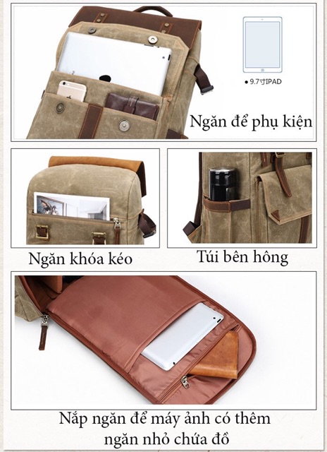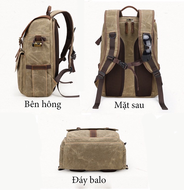Balo máy ảnh vải canvas cao cấp Batik full photo Giá: 920.000 VNĐ (Bảo hành 6 tháng) Balo có thiết kế thời trang, kiểu dáng cổ điển. Balo được làm từ vải canvas cao cấp chống thấm nước rất tốt, được phối hợp với da bò thật tạo nên sự sang trọng cho chiếc balo. Ngăn máy ảnh nằm sau lưng balo giúp bảo vệ máy ảnh của người dùng luôn được an toàn nơi đông người. Balo có lớp mút dày, vách ngăn êm giúp bảo vệ máy ảnh khỏi những va chạm. Vách ngăn bên trong có thể tháo dời và di chuyển dễ dễ dàng sắp xếp đồ dùng. Mặt trước túi có nhiều ngăn nhỏ để phụ kiện mang theo rất tiện lợi. Bên hông có ngăn để bình nước. Kích thước: 45cm * 31cm *18cm (Cao*ngang*sâu) Màu sắc: Vàng kaki và xanh Balo có thể để được 1 body kèm 4-5 lens và phụ kiện. #balomayanh #balodungmayanh #balomayanhfullphoto #phukienmayanh
