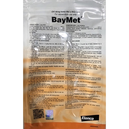 Baymet, sản phẩm chuyên dùng Hấp phụ độc tố và Giải quyết bệnh phát sáng do vi khuẩn Vibrio trên tôm cá, Bệnh nhiễm khuẩn như suất huyết, đốm đỏ, hậu môn sưng đỏ trên cá nước ngọt - Dạng bột mịn, trộn chung với thức ăn. - Liều lượng 3-5g/kg thức ăn
