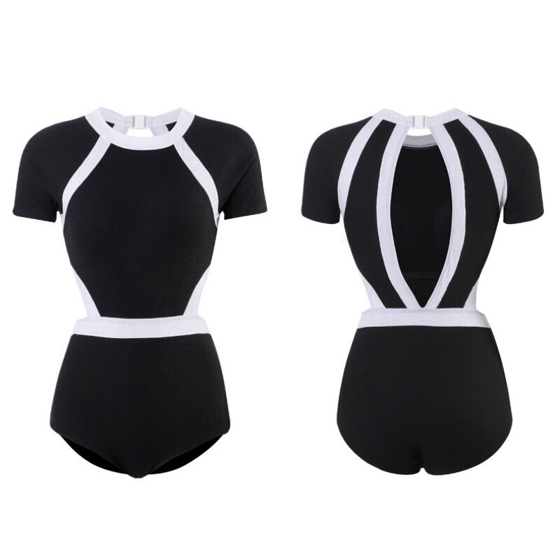 Bikini Đồ bơi liền mảnh có tay khoét eo màu đen viền trắng cá tính