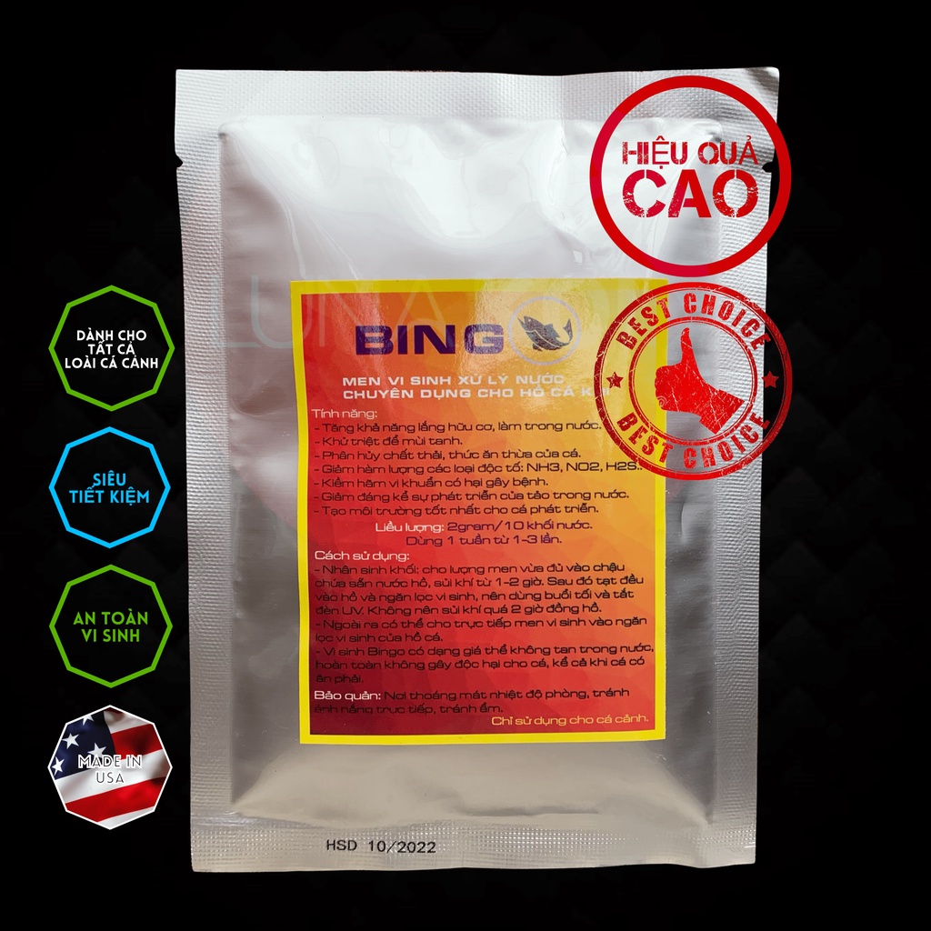 BỘ SẢN PHẨM LÀ KINH NGHIỆM THỰC TIỄN CỦA LUNA KOI HƠN 8 NĂM TRONG NGHỀ CÁ CẢNH, SẢN XUẤT VÀ CHĂM SÓC HÀNG TRIỆU CON CÁ KOI, CÁ CẢNH CÁC LOẠI NỘI NGOẠI NHẬP. RẤT HIỆU QUẢ VÀ TIẾT KIỆM. Men vi sinh Bingo chuyên xử lý nước hồ cá Koi, làm trong nước, khử mùi hôi tanh, khử chất độc NH3, NO2, H2S... hiệu quả nhất hiện nay. Siêu tiết kiệm và hiệu quả nhanh chóng nhìn thấy được. HIỆU QUẢ NGAY SAU LẦN SỬ DỤNG ĐẦU TIÊN!!! LIỀU DÙNG: - Liều lượng sử dụng: 2g / 10 khối nước (tối đa chỉ dùng liều gấp 3 nếu hồ đang quá dơ hoặc nhiễm độc nặng). Không nên sử dụng vượt liều lượng qui định quá nhiều sẽ làm hồ có hiện tượng bị bọt lâu tan, do mật độ vi sinh quá nhiều cùng 1 lúc trong hồ sẽ cạnh tranh oxy dẫn đến chết vi sinh, sập vi sinh. CÁCH SỬ DỤNG: - Hiệu quả nhất là sục khí từ 1-1.5 tiếng trước ở ngoài thau nước sạch, rồi tạt đều vào hồ. - Nếu không có thời gian có thể cho men trực tiếp vào ngăn lọc vi sinh. - 1 tuần có thể dùng từ 2-3 lần. Khi vi sinh đã ổn định thì 1 tuần dùng 1 lần là đủ. - Nếu muốn ức chế tảo tối đa nên sử dụng vào ban đêm (với đèn UV diệt tảo tắt). QUY CÁCH: Gói 100g Hạn sử dụng: 2 năm kể từ ngày sản xuất. Chỉ sử dụng cho cá cảnh.