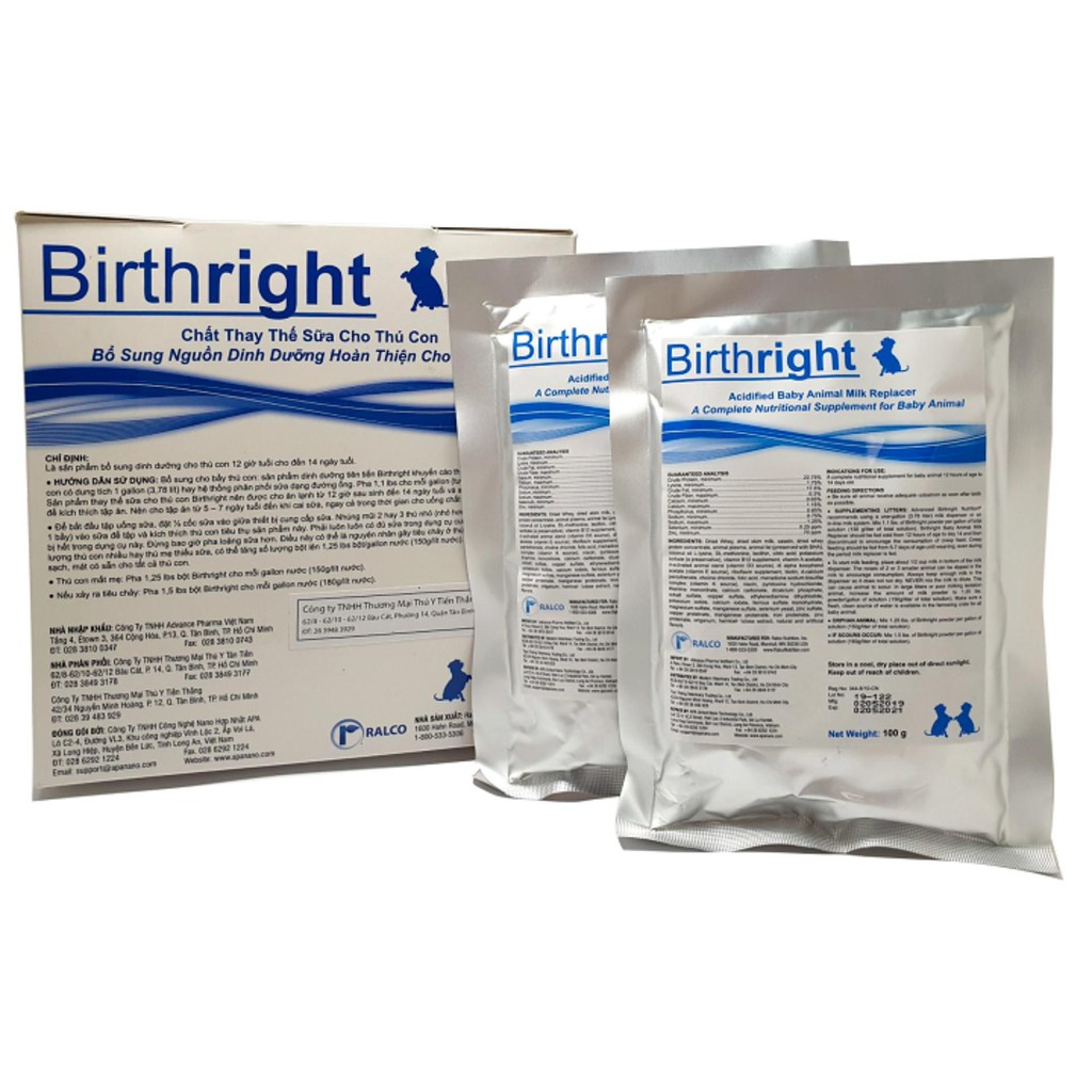 XUẤT XỨ: Mỹ BIRTHRIGHT là sản phẩm sữa bột thay thế sữa mẹ dành cho chó mèo sơ sinh của nhãn hàng Ralco Nutrition tại Mỹ .Chất bổ sung dinh dưỡng hoàn chỉnh cho chó mèocon trong vòng 12 giờ tuổi. CÔNG DỤNG: BIRTHRIGHT chất bổ sung dinh dưỡng hoàn chỉnh cho chó mèo sử dụng trong trường hợp: Chó mèo mẹ bị mất sữa hoặc do con bầy quá đông Bổ sung dinh dưỡng và hạn chế các vấn đề tiêu hóa cho chó mèo còi cọc chậm lớn, biếng ăn. Chó mèo con mất mẹ, bị bỏ rơi THÀNH PHẦN:Whey sấy khô, sữa tách béo sấy khô, casein, thức ăn đậm đặc protein từ whey sấy khô, chất béo,dầu dừa, các loại acid amin, vitamin (B12,AD3,E, K), biotin, khoáng và các loại tinh dầu tự nhiên với hàm lượng calories cao tương tự như nguồn sữa mẹ. HƯỚNG DẪN SỬ DỤNG: Trộn 1 phần sữa với 5 phần nước ấm (hoặc 5g sữa với khoảng 10-15ml), để nguội trước khi cho chó hoặc mèo uống. Đối với chó hoặc mèo con từ 3-4 giờ uống 1 lần, chó lớn hoặc mèo lớn 8 giờ uống 1 lần. Sữa sau khi pha không để qua đêm. Nên gập kín miệng túi lại sau khi mở. Bảo quản nơi khô ráo thoáng mát.