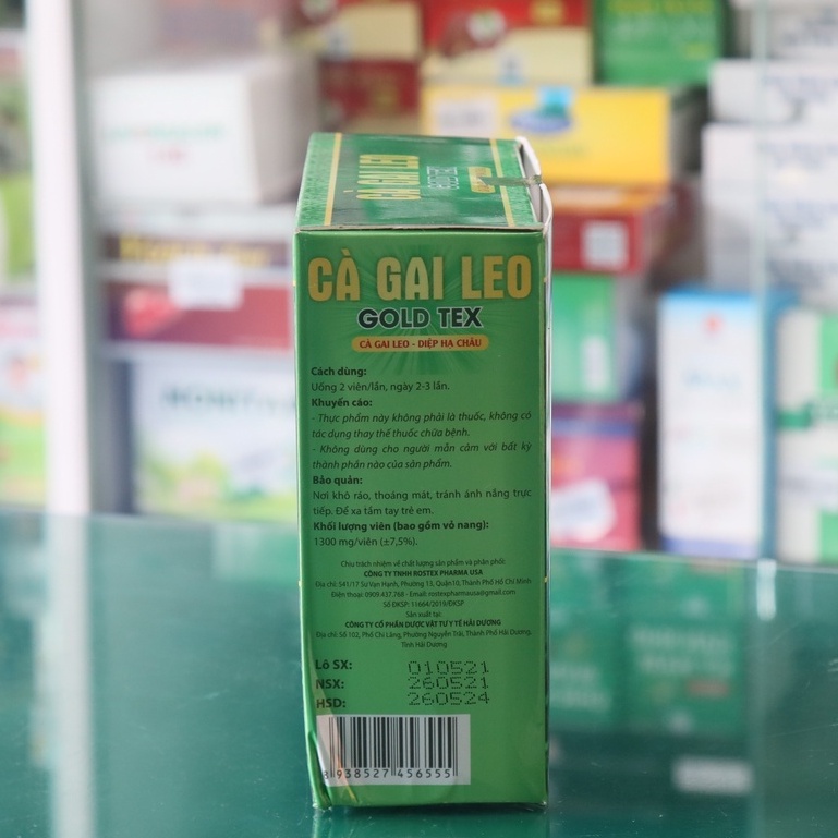 Công dụng của cà gai leo goldtex Cà gai leo Goldtex là thực phẩm bảo vệ sức khỏe có công dụng giúp hỗ trợ làm mát gan và hỗ trợ giúp giải độc gan. Giúp bảo vệ gan, hỗ trợ giảm nguy cơ tổn thương gan do rượu bia, hóa chất độc hại. Lưu ý: Sản phẩm đã được Cục ATTP – Bộ Y Tế cấp phép dưới dạng thực phẩm sức khỏe lưu hành toàn quốc. Cách sử dụng Sử dụng mỗi ngày 2 viên và mỗi lần sử dụng từ 2-3 lần. Đối tượng sử dụng Sản phẩm thích hợp sử dụng cho người sử dụng nhiều rượu bia và sử dụng thuốc kháng sinh dày ngày gây hại cho gan. Sử dụng cho người bị suy giảm chức năng gan do xơ gan, viêm gan. Sử dụng cho người bị vàng da, mẩn ngứa, mệt mỏi, chán ăn, tiểu vàng, men gan cao do chức năng gan bị suy giảm. Thành phần của Cà gai leo Goldtex Cao khô hỗn hợp 90mg tương đương những thảo dược thiên nhiên như: Diệp Hạ Châu 250mg Mật Nhân 62,5mg Cát Căn 62,5mg Giảo Cổ Lam 62,5mg Bìm Bìm 62,5mg Rau Má 62,5mg Nhọ Nồi 62,5mg Cao Cà Gai Leo 60mg Cao Cardus Marianus (Cao Kế Sữa) 50mg Cao Actiso 10mg Nano Curcuminoids 5% 10mg Phụ liệu: Dầu đậu nành, dầu cọ, sáp ong trắng, Lecithin, Gelatin, Glycerin, dung dịch Sorbitol 70%, Nipagin, Nipasol, Titan dioxyd, màu Brown HT, Vanilin, Ethanol 96%, nước tinh khiết vừa đủ 1 viên. Lưu ý! Sản phẩm Cà gai leo Goldtex không phải là thuốc và không có tác dụng thay thế thuốc chữa bệnh. Không sử dụng cho người mẫn cảm với bất kỳ thành phần nào của sản phẩm. Đọc kĩ hướng dẫn sử dụng trước khi dùng. Sản xuất tại CÔNG TY CỔ PHẦN DƯỢC VẬT TƯ Y TẾ HẢI DƯƠNG Địa chỉ: Số 102, Phố Chi Lăng, Phường Nguyễn Trãi, TP. Hải Dương, Tỉnh Hải Dương. Chịu trách nhiệm về chất lượng sản phẩm và phân phối CÔNG TY TNHH ROSTEX PHARMA USA Địa chỉ: Số 541/17 Sư Vạn Hạnh, Phường 13, Quận 10, TP. HCM Giấy tiếp nhận đăng ký bản công bố sản phẩm Số: 11664/2019/ĐKSP #cagaileo #caocagaileo #mengancao #gannhiemmo #nhathuocthanthien