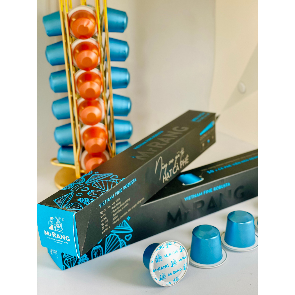 Nguồn gốc/ Origin : Việt Nam Vùng/ Region : Đắk Nông Giống/ Variety : Robusta Chế biến/ Processing : Phơi nắng tự nhiên/ Narural/ Sunrise Độ cao/ Altitude : 900 m Hương vị/ Tasting note : Hương chocolate, hậu vị ngọt, đắng vừa/ Chocolate flavor, sweet aftertaste, medium bitter. Đóng gói/ packing: Mỗi hộp chứa 10 viên nén cà phê rang xay của hạt cà phê được trồng tại Đắk Nông. Cà phê được đóng gói tự động có khí nito để bảo quản cà phê thơm ngon và lâu hơn. Each box contains 10 roasted coffee capsules of coffee beans grown in Dak Nong. The coffee is automatically packed with nitrogen gas to preserve the delicious and long-lasting coffee. Hạn sử dụng: 12 Tháng kể từ ngày sản xuất. Expiry date: 12 months from date of manufacture.