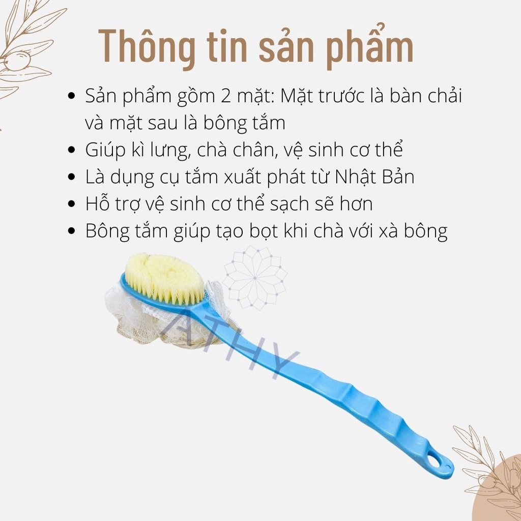 BÀN CHẢI CHÀ LƯNG KÈM BÔNG TẮM Sản phẩm gồm 2 mặt: Mặt trước là bàn chải và mặt sau là bông tắm Giúp kì lưng, chà chân, vệ sinh cơ thể Là dụng cụ tắm xuất phát từ Nhật Bản Hỗ trợ vệ sinh cơ thể sạch sẽ hơn Bông tắm giúp tạo bọt khi chà với xà bông Dụng cụ giúp vệ sin