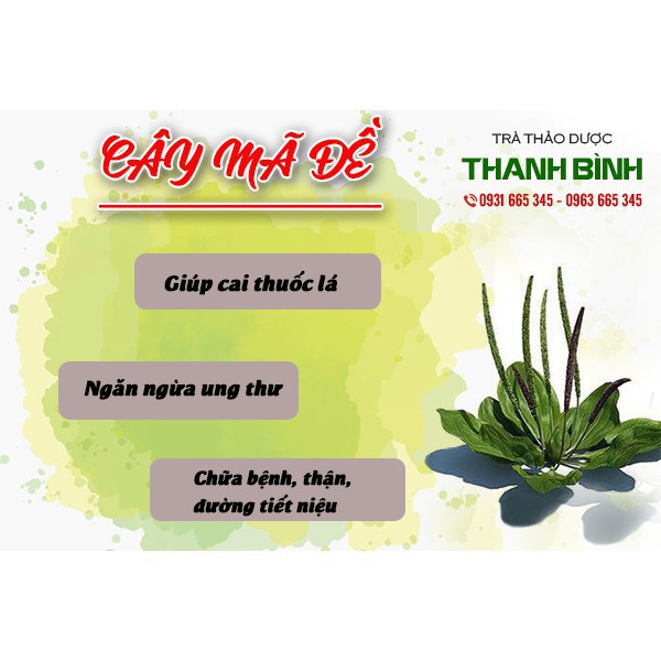 🚗 Thảo Dược Thanh Bình với hơn 20 năm kinh nghiệm, Chúng tôi có quy trình hoàn chỉnh từ khâu chọn lọc kĩ lưỡng nguyên liệu đầu vào đến hệ thống sản xuất, đóng gói hoàn chỉnh. Sự hài lòng của khách hàng là minh chứng về chất lượng và uy tín của chúng tôi.🚗 --------------- ♻️ Thông Tin Sản Phẩm ✔️ TH.ƯƠNG H.IỆU: Thảo Dược Thanh Bình ✔️ X.UẤT X.Ứ: Việt Nam ✔️ QUY CÁCH: Sản phẩm được đóng túi kiếng ✔️ NXS & HSD: In trên bao bì ------------- ♻️♻️♻️ MÔ TẢ SẢN PHẨM ♻️♻️♻️ Gi.úp thanh nhiệt cơ thể - mát gan - điều tr.ị sỏi thận, sỏi mật.... ‼️‼️ BỎ TH.UỐC LÁ là điều mà hầu hết y học trên thế giới ủng hộ, tuy nhiên việc cai th.uốc lá lại không hề dễ dàng, nhất là với người có t.iền sử hút th.uốc nhiều năm. Rất may mắn vì tình cờ, với một cách vô cùng đơn giản của một Tiến sĩ người Nga. 📣📣 Chuyên gia về tiêu hóa, chúng ta đã có thể bỏ th.uốc chỉ trong vòng nữa tuần lễ. Vậy bác sĩ đó đã dùng nguyên liệu gì để tạo nên điều kì diệu đó ??? 👉 Được dân gian biết đến như một vị th.uốc quý dùng để chữa b.ệnh vì cây mã đề dùng rất mát lại có tác dụng bổ thận giúp tăng cường đào thải các chất độc cho thận, chữa các b.ệnh về sỏi, viêm kết mạc, viêm gan, dùng chữa ho lâu ngày, viêm phế quản, viêm bàng quang, tiểu tiện ra máu... và một công dụng đặc biệt của cây mã đề được khá nhiều sự quan tâm của các bác muốn cai th.uốc lá. ------------- Hotline: 0963 665 345 - 0931 665 345 - 0945 695 345 (Mr.Bình) Địa chỉ: 119/24 Bùi Quang Là, Phường 12, Gò Vấp, TPHCM. "Sản phẩm này không phải là th.uốc và không có tác dụng thay thế th.uốc chữa b.ệnh"
