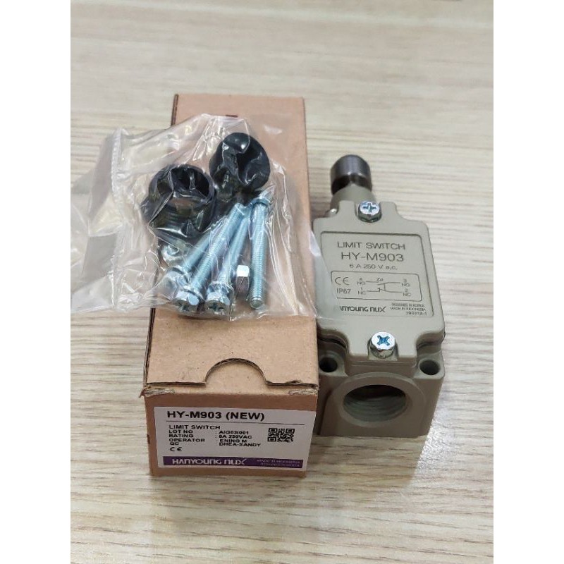 "Công tắc hành trình HY-M Hanyoung. Dòng định mức 6A. 250VAC -M902 thiết bị truyền động dạng con lăn. -M903 thiết bị truyền động dạng bi. -M904 thiết bị truyền động cần gạt dạng con lăn, có thể điều chỉnh. -M907 thiết bị truyền động dạng que. -M908 thiết bị truyền độn