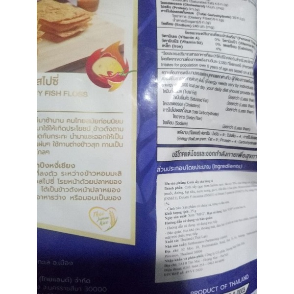 Cơm cháy chà bông Thái Lan được ép thành những miếng mỏng được phủ bên trên lớp chà bông mặn mặn, ngọt ngọt, giòn giòn. Các hương vị hòa quyện vào nhau tạo nên hương vị thơm ngon mới lạ khó quên. Sản phẩm được làm từ các thành phần nguyên liệu tự nhiên nên rất an toàn