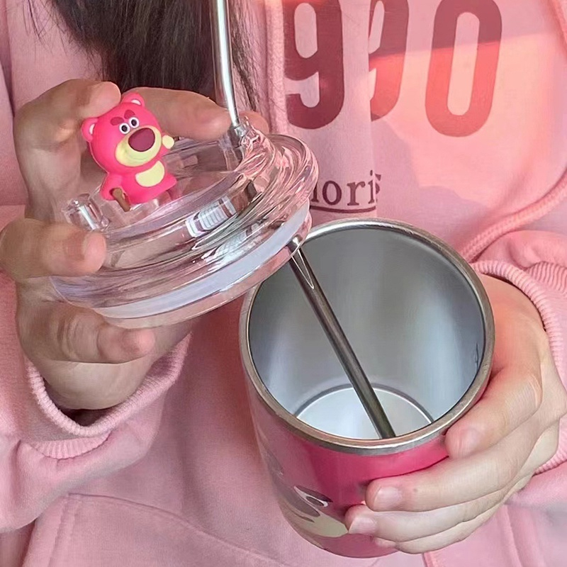 Cốc Giữ Nhiệt Gấu Dâu Kèm Ống Hút Bằng Thép Không Gỉ 450ml - Ly Giữ Nhiệt Lõi Inox 304 - Bình Nước Giữ Nhiệt