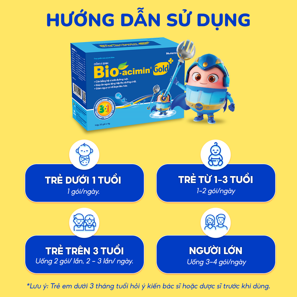 Cốm vi sinh Bio - acimin Gold hỗ trợ trẻ ăn ngon tự nhiên bổ sung vi chất và các amin thiết yếu hộp 30 gói 1. MÔ TẢ SẢN PHẨM - Tên sản phẩm: Cốm vi sinh Bio acimin Gold - Thương hiệu: Bio acimin - Xuất xứ: Việt Nam - Hạn sử dụng: 36 tháng kể từ NSX - Đặc điểm nổi bật: + Cốm vi sinh Bio-acimin Gold - Giải pháp hỗ trợ trẻ ăn ngon tự nhiên, khỏe mạnh và lớn nhanh mỗi ngày + Bổ sung vi khuẩn có ích, ức chế vi khuẩn có hại, giúp lập lại cân bằng hệ vi sinh đường ruột. + Hỗ trợ giảm nguy cơ rối loạn tiêu hóa do loạn khuẩn đường ruột hoặc do dùng thuốc kháng sinh dài ngày. + Bổ sung vi chất và các acid amin thiết yếu cho cơ thể, kích thích ăn ngon, tăng cường hấp thu dưỡng chất. 2. THÀNH PHẦN Một gói cốm vi sinh Bio-acimin Gold 4g bao gồm: + Bacillus coagulans.......................................108CFU + DHA 10%.......................................................5mg + Coenzym Q10.................................................2mg +.Beta Glucan 80%............................................10mg + Acid folic..........................................................150 µg + Vitamin D3........................................................80UI + Selen hữu cơ......................................................10µg + Kẽm sulfat..........................................................2,5mg + Tinh chất men bia...............................................1,2g + Phụ liệu: Glucose, maltodextrin, đường trắng, hương sữa, NaCMC......01 gói vừa đủ 3. ĐỐI TƯỢNG SỬ DỤNG - Trẻ biếng ăn, kém hấp thu, rối loạn tiêu hóa do loạn khuẩn đường ruột hoặc do dùng kháng sinh gây nên các triệu chứng: đầy bụng, khó tiêu, tiêu chảy, táo bón, phân sống… Trẻ suy dinh dưỡng, chậm lớn, trẻ hay ốm yếu do sức đề kháng kém. - Trẻ trong giai đoạn phát triển cần bổ sung dưỡng chất cho sự phát triển thể chất. - Người lớn bị rối loạn tiêu hóa do loạn khuẩn đường ruột hoặc do dùng kháng sinh dài ngày. - Chú ý: Trẻ em dưới 3 tháng tuổi hỏi ý kiến bác sĩ hoặc dược sĩ trước khi dùng Trẻ bị rối loạn tiêu hóa cấp tính hỏi ý kiến bác sĩ hoặc dược sĩ về việc tăng cường liều dung 4. HƯỚNG DẪN SỬ DỤNG - Trẻ em: + Trẻ trên 6 tháng tuổi: 1gói/ngày + Trẻ từ 1 – 3 tuổi: 1 – 2 gói/ngày + Trẻ trên 3 tuổi: 2 – 3 gói/ngày - Người lớn: + Uống 3-4 gói/ngày, dùng trong các trường hợp đầy bụng, khó tiêu, táo bón, tiêu chảy, phân sống, loạn khuẩn đường ruột do dùng kháng sinh, uống nhiều bia rượu. 5. BẢO QUẢN: - Nơi khô ráo, tránh xa tầm tay trẻ em 📌 Thực phẩm này không phải là thuốc và không có tác dụng thay thế thuốc chữa bệnh. ------------DƯỢC PHẨM MERACINE------------ THƯƠNG NHÂN SẢN XUẤT VÀ CHỊU TRÁCH NHIỆM SẢN PHẨM - THƯƠNG NHÂN SẢN XUẤT CÔNG TY CỔ PHẦN NGHIÊN CỨU VÀ SẢN XUẤT DƯỢC PHẨM MERACINE đạt các tiêu chuẩn GMP-WHO, tiêu chuẩn GLP, tiêu chuẩn GSP, giấy chứng nhận CGMP-ASEAN. - ĐƠN VỊ PHÂN PHỐI CÔNG TY CỔ PHẦN DƯỢC PHẨM MERACINE #combio #acimin #Me&be #Vitaminchobe #chamsocsuckhoebe #menvisinh #mentieuhoa #comvisinh #comBioaciminGold #combosungchatxo #comvisinhchobe #chongtaobon #bosungloikhuanduongruot #shopee