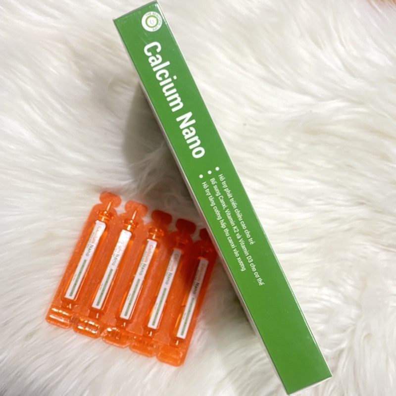 CALCIUM NANO HỘP 20 ống x 10ml ——————- THÀNH PHẦN - Canxi carbonate nano: 3000mg - DHA: 100mg - Vitamin PP: 50mg - Vitamin A: 2000mcg - Vitamin K2 - MK7: 100mcg - Vitamin D3: 200UI Phụ liệu vừa đủ 100ml ————————- CÔNG DỤNG Bổ sung canxi, vitamin K2, vitamin D3 cho cơ