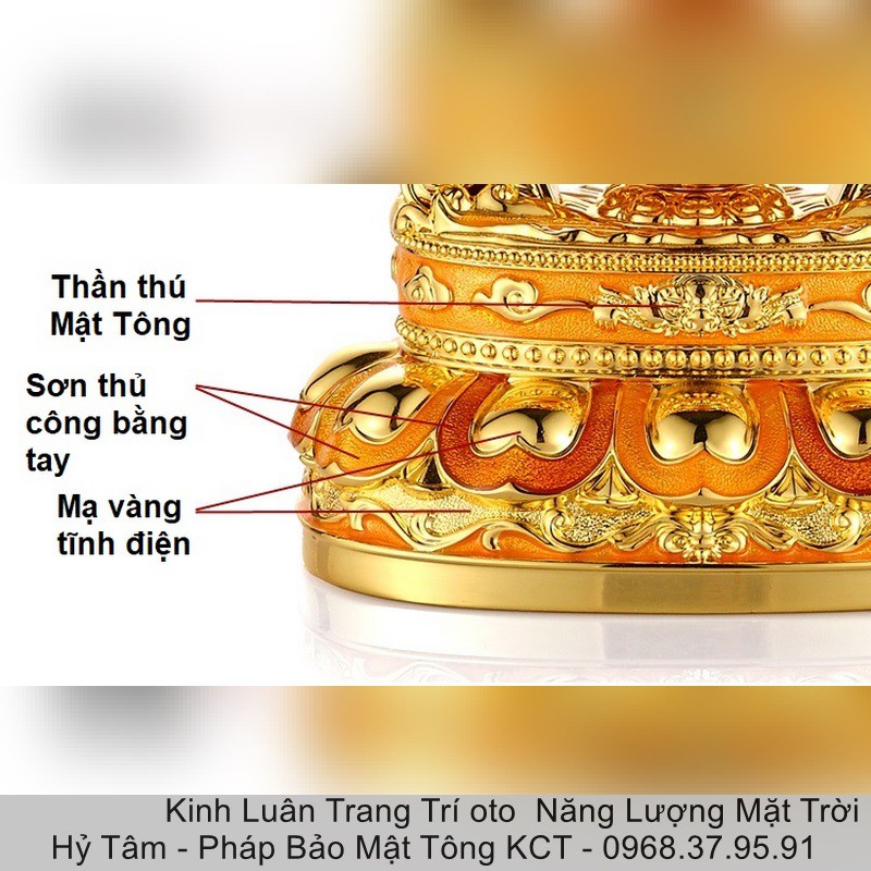 Chất liệu: Hợp kim nạm men ngọc Kích thước ~12cmx9cmx7,5cm Các biểu tượng: Ngọc báu mani, Thần thú bảo hộ (Rồng,Phượng), Lục tự đại minh Sử dụng pin và miếng năng lượng mặt trời Thiết kế tỉ mỉ tinh tế Kinh Luân - Phương tiện thiện xảo của Chư Phật Cấu tạo của k