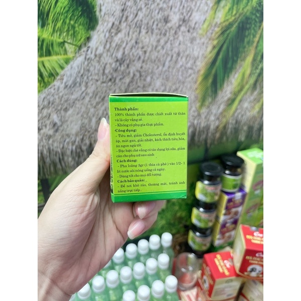 Cao chè vằng lợi sữa giảm cân [Hũ thủy tinh 100 gram] CÔNG DỤNG CHÍNH CỦA SẢN PHẨM: Chè vằng là một phương th quý trong y học cổ truyền và thường được ví như “vàng đen” bởi những công dụng vô cùng tuyệt vời của nó. Được chiết suất 100% từ thân và lá cây vằng sẻ. Thành phần chính của cao chè vằng là Alcaloid, Flavonoid, Glycosit… Đây là những chất đã được khoa học chứng minh là có tác dụng tốt trong việc chống v kháng kh , giúp vết thương mau lành, thông huyết, điều k , hỗ trợ điều tr bệnh đau x khớp, thiếu máu, huyết áp cao, giảm tình trạng mệt mỏi, kém ăn. • Tăng tiết sữa, chống v tắc tuyến sữa, tia sữa sau sinh. • Lấy lại vóc dáng cho các mẹ sau sinh. • Giúp hạ và ổn định huyết áp. • Mát gan, giải nhiệt, kích thích tiêu hóa, ăn ngon ngủ tốt. CÁCH DÙNG: • Pha loãng 3gr (khoảng 1 thìa cà phê) vào 1/2-1 lít nước sôi nóng uống cả ngày • Dùng tốt cho mọi đối tượng 0972345612