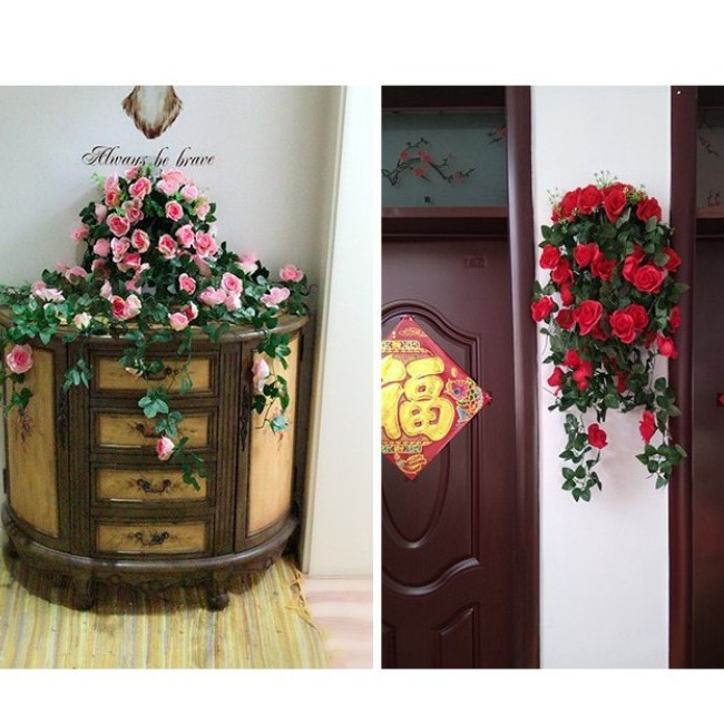 THÔNG TIN SẢN PHẨM: ✪ Kích thước: tổng chiều dài 1m + chiều dài chùm tầm 90cm, + định lượng: 1 chùm chia 5 dây rũ và lá, tầm 15-17 đầu bông hồng. ✪ Chất liệu: nhựa PVC, Vải polyeste - Đầu hoa và lá có thể bị rơi khỏi cuống cành trong quá trình vận chuyển, khách có
