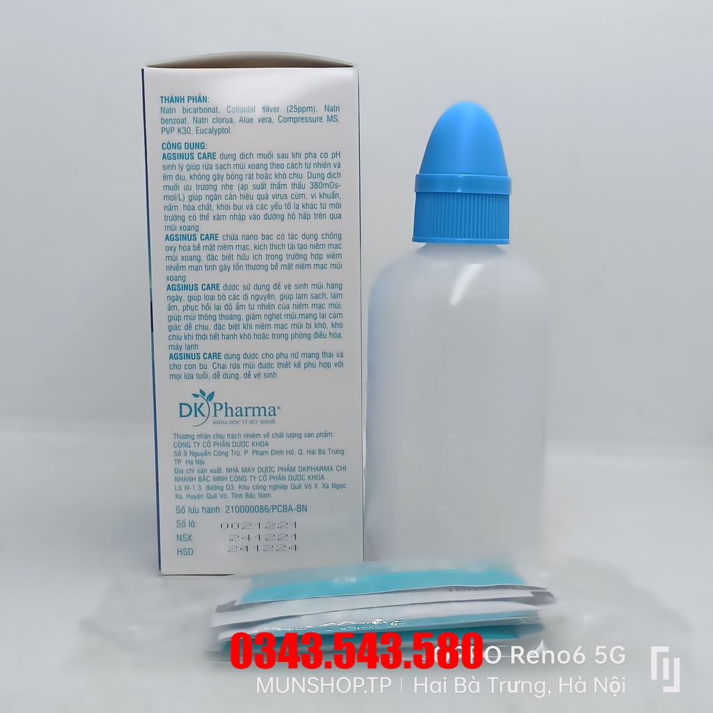 THÀNH PHẦN: Natri bicarbonat, Colloidal silver, Natri benzoat, Natri clorua, Aloe vera, Copressure MS, PVP K30, Eucalyptol. CÔNG DỤNG: AGSINUS CARE dung dịch muối sau khi pha có PH sinh lý giúp rửa sạch mũi xoang theo cách tự nhiên và êm dịu, không gây bỏng rát hoặc