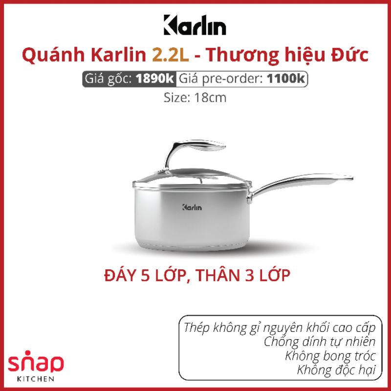 🔥Được thiết kế nhỏ gọn, kiểu dáng sang trọng chuẩn Châu Âu ☑️Ưu điểm và tiện ích: ☄️ Đáy 5 lớp, đúc nguyên khối dẫn nhiệt nhanh, giữ nhiệt lâu giúp tiết kiệm thời gian và nhiên liệu ☄️ Tay cầm thiết kế dạng khoen hở giúp tản nhiệt nhanh, không gây nóng, linh hoạt trong khi nấu ☄️ Nắp kính cường lực và khả năng chịu nhiệt cao, bóng loáng ☄️Phù hợp cho mọi loại bếp: bếp gas, bếp điện, bếp từ, bếp hồng ngoại 📍 Thông số nồi Karlin: - Size 24cm - Dung tích 5,3L - Chiều cao nồi 12,5cm - Cân nặng: 2kg - Kèm nắp kính cường lực 📍 Thông số Quánh - Size 18cm - Dung tích 2.2lit - Chiều cao nồi 9.5cm - Cân nặng: 1.1kg - Kèm nắp kính cường lực 📍 Thông Số Chảo - Size 24cm - Dung tích - Chiều cao nồi 4,5cm - Cân nặng: 1.2kg - Kèm nắp kính cường lực