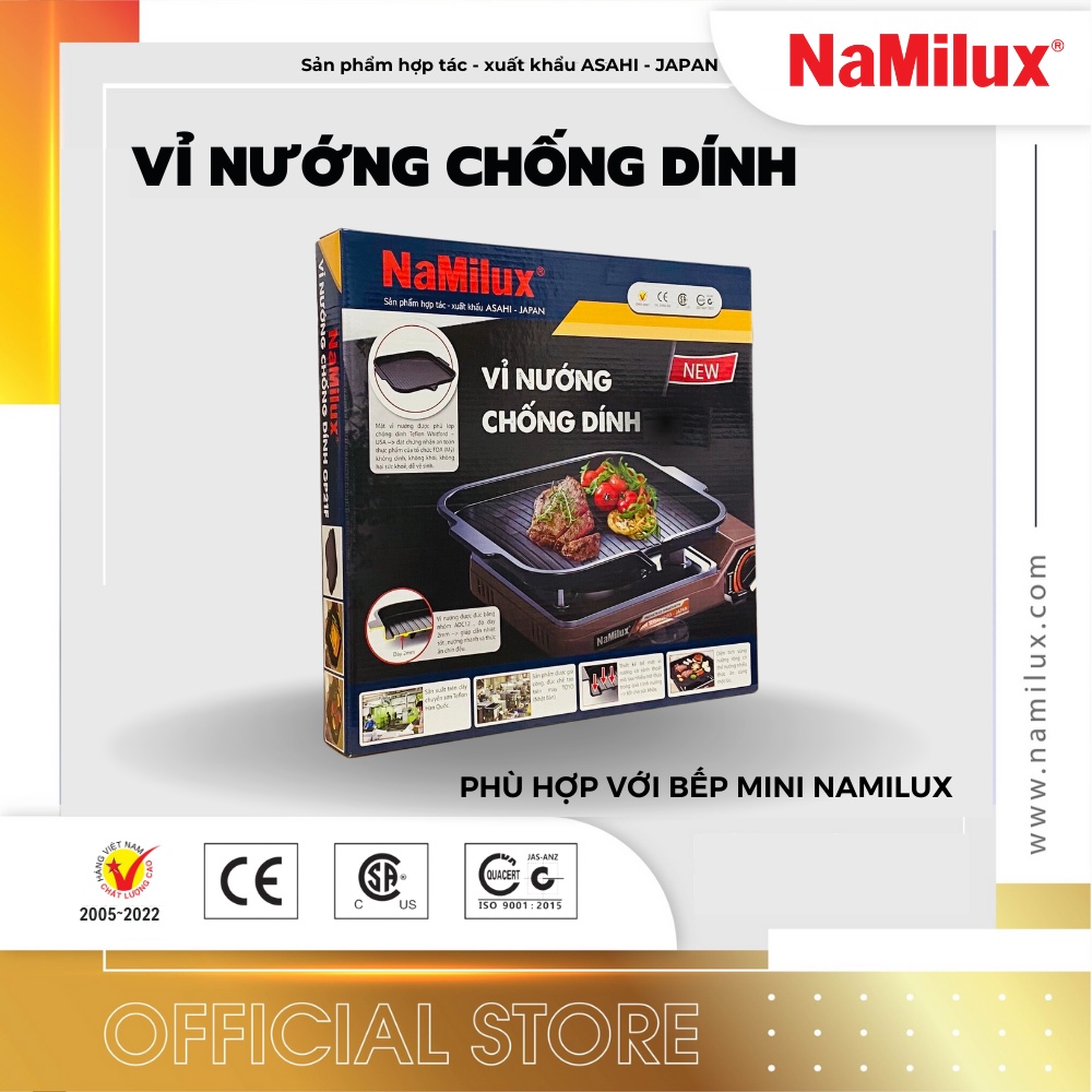 AN TOÀN Mặt vỉ nướng được phủ lớp chống dính Teflon Whitford (USA) – đạt chứng nhận an toàn thực phẩm của tổ chức FDA (Mỹ), không dính, không khói, không hại sức khoẻ, dễ dàng vệ sinh Thiết kế bề mặt vỉ nướng có rãnh thoát dầu thẳng không bị nghẹt, loại nhiều mỡ thừa trong quá trình nướng tốt cho sức khoẻ Thiết kế 4 chân vừa khớp với 4 chân kiềng bếp giúp cố định vỉ nướng không bị vênh, ngã đổ. CÔNG NGHỆ SẢN XUẤT HIỆN ĐẠI Sản xuất trên dây chuyền sơn Tefflon Hàn Quốc Sản phẩm được gia công, đúc chế tạo trên máy TOYO (Nhật Bản) NƯỚNG ĐA DẠNG THỰC PHẨM - NHANH - NGON - ĐỀU Vỉ nướng được đúc bằng Nhôm ADC12, độ dày 2mm giúp dẫn nhiệt tốt, nướng nhanh và thức ăn chín đều Diện tích vùng nướng rộng có thể nướng tất cả các loại thực phẩm như thịt, hải sản, rau, củ…. cùng 1 lúc THÔNG SỐ KỸ THUẬT Trọng lượng: 690 gam Kích thước: D328 x R318 x C39 (mm) Áp dụng TCCS: 04:2021/CTY-VINA Xuất xứ: Việt Nam ƯU ĐÃI ĐẶC BIỆT: LON GAS MINI NAMILUX 220G giá: 22,000 đồng/lon chưa bao gồm phí Ship (Áp dụng giao nội thành HCM) ĐẶT HÀNG: LIÊN HỆ ZALO 038 993 1615