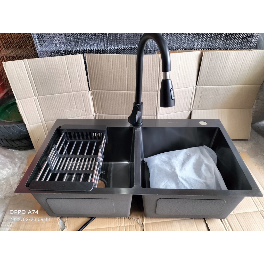 Chậu inox sus 304 phủ nano đen, lớp phủ dày 5 lớp, chống trầy, chống bẩn, không bị han gỉ Vòi rửa chén nóng lạnh inox 304 phủ nano, vừa tất cả chậu, quay trái phải dùng được 2 hộc chậu LƯU Ý: KHÁCH HÀNG khi mua hàng trên gian hàng công ty vui lòng đọc kĩ thông tin sản phẩm và phần phân loại mua cho đúng theo nhu cầu của mình - Phân loại Chậu+xả+rổ: gồm chậu, bộ xả thoát nước của chậu, rổ rút đa năng - Phân loại Chậu+xả+rổ+vòiNL: gồm chậu, bộ xả chậu, rổ rút đa năng, vòi rửa chén rút NL - Phân loại Chậu+xả+rổ+vòiNL+BXB: gồm chậu, bộ xả chậu,vòi rửa chén rút nóng lạnh, bình đựng nước rửa chén,rổ rút đa năng Kích thước phủ bì : 82x45x23cm Khoét đá: 79x42cm - Rổ rút đa năng kéo dài co ngắn được,có chốt cố định chậu nào cũng vừa, để đựng trái cây thực phẩm úp bát- -Bình rửa chén âm thành chậu là bình nhấn hơi 100% inox, gắn âm thành chậu, khi hết nước rửa chén thì rút đầu vòi ra không cần tháo bình ra, xong đổ nước rửa chén vào nhấn nhấn hơi giống bình sữa tắm của mấy chị -Ống xả nước rộng xả nước nhanh không gây tắc nghẽn nước. Lọc rác bằng inox 304 có khắc chữ SUS 304. Bầu xả chậu được thiết kế chống mùi hôi. Xả chậu 2 lớp lớp ngoài nhựa lớp trong inox Bề ngoài chậu có miếng chống ồn xung quanh, có phun bọt đen chống ẩm -Giao hàng nhanh chóng, hàng có sẵn tại kho -Bảo hành: 24 tháng tại công ty, bảo hành điện tử bằng đơn mua hàng và số điện thoại