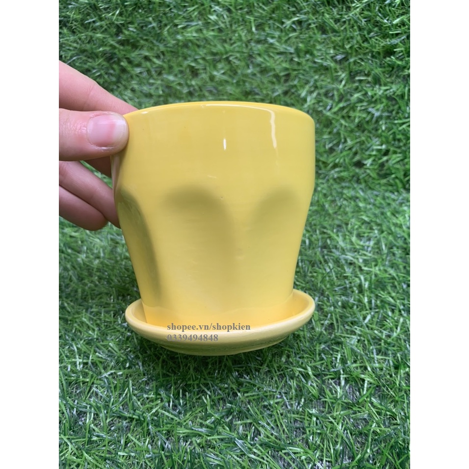 Chậu trồng cây mini - Chất liệu: gốm sứ - Kích thước: cao 10cm miệng rộng 9.5cm - Chậu có lỗ thoát nước - Có đĩa đựng nước nếu tưới cây bị dư nước - Kiểu dáng chậu vát, có đường kẻ ngang hoặc hõm trên thân chậu - Màu sắc trẻ trung, phù hợp trồng những cây nhỏ xinh để trên bán. Khách hàng chọn theo phân loại màu