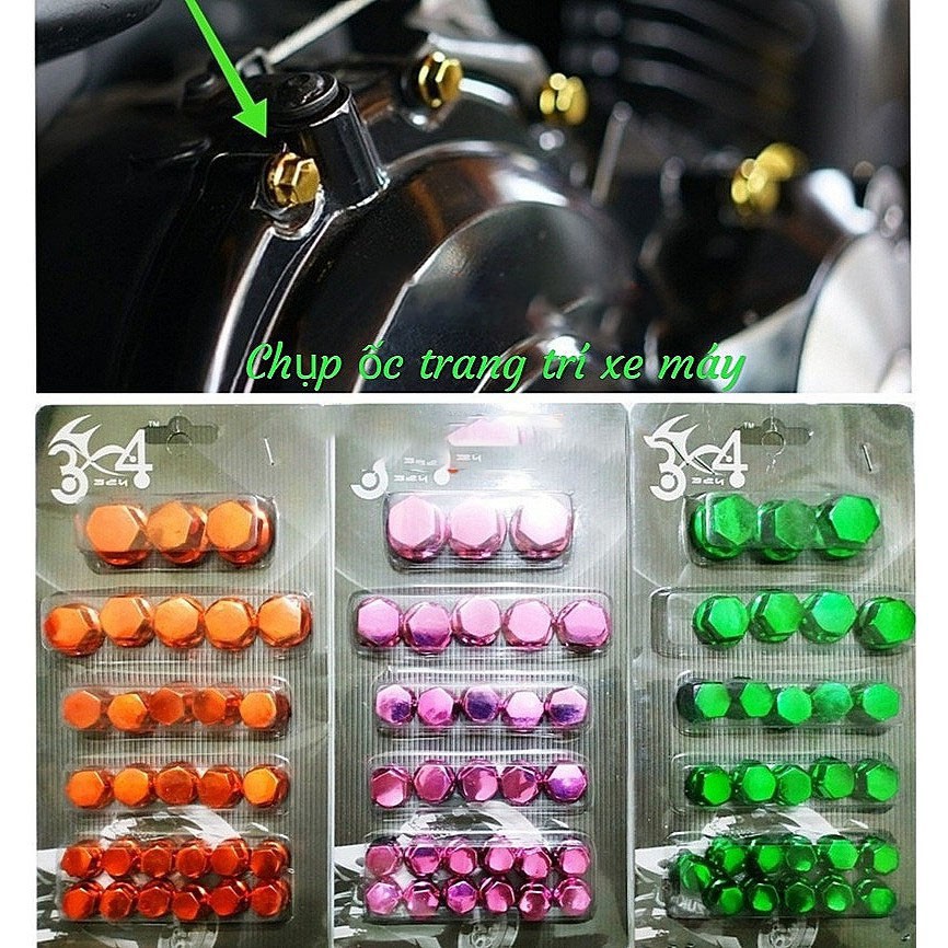 Bộ chụp ốc trang trí xe máy Được làm từ chất liệu nhựa ABS phủ màu bóng Bộ ốc được lắp trong vỉ gồm 30 con ốc kích cỡ khác nhau đủ sử dụng cho xe của Sản phẩm có màu : xanh dương,xanh lá,đỏ,hồng tím,vàng Giúp bạn tự tay trang trí xe của mình thêm nổi bật và thời tran