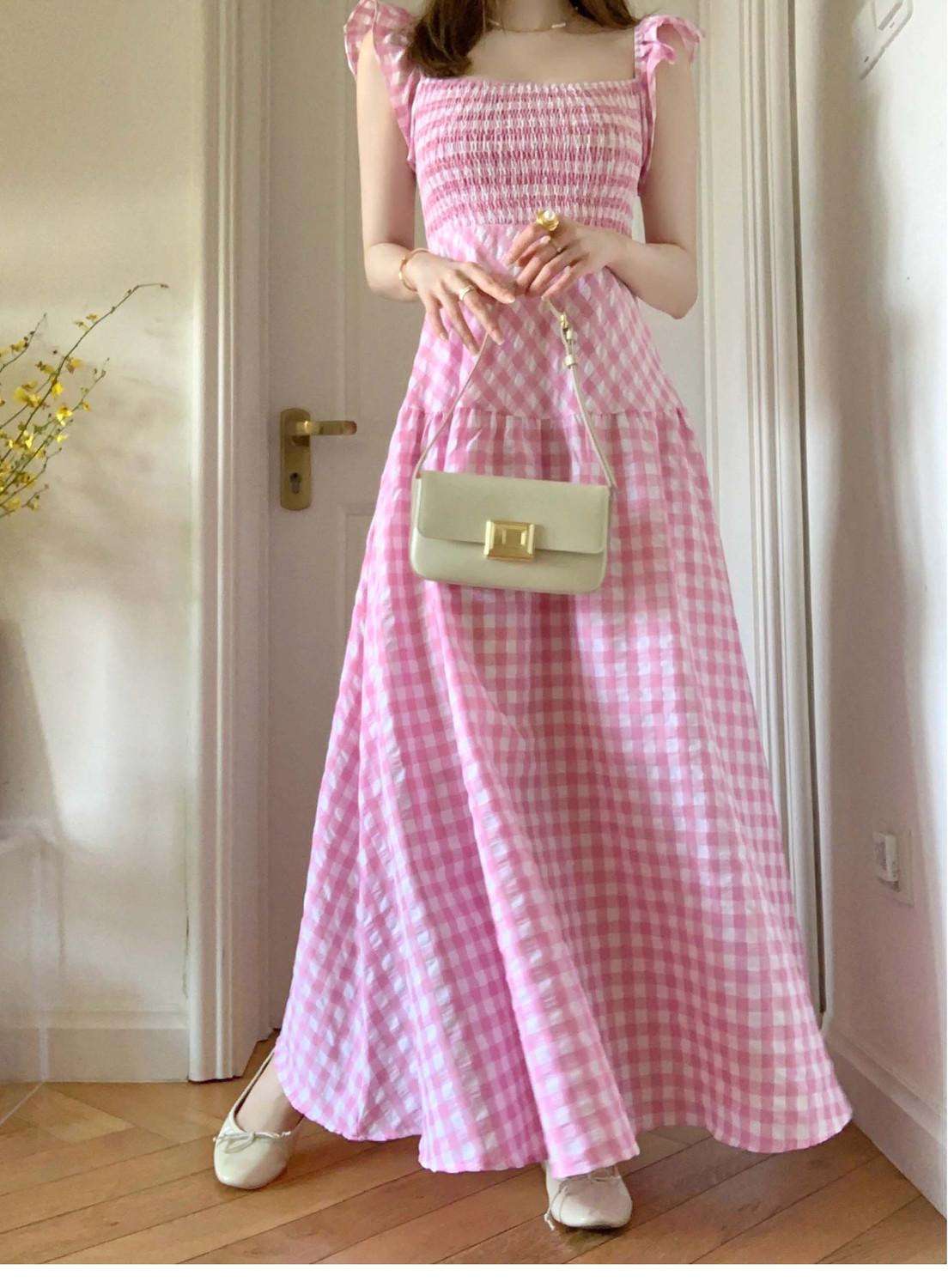 CHENGRUI Cao cấp bông màu hồng kẻ sọc ăn mặc cho phụ nữ Pháp retro nhỏ thiết kế cao cấp giảm tuổi váy dài dễ thương