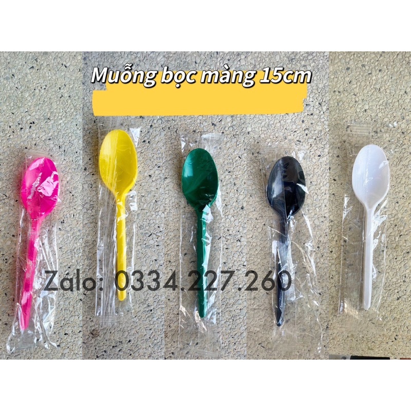 Combo 100 muỗng nhựa 15cm bọc nilong cao cấp, muỗng trà sữa bọc màng màu đen, trắng, xanh lá, hồng, vàng