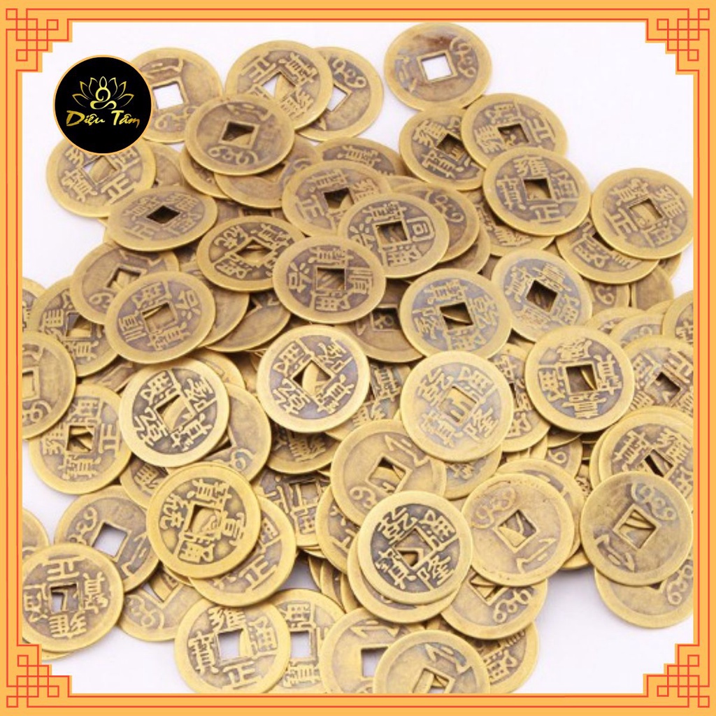 Chất liêu: đồng vàng Kích thước:2cm Mặt trước đồng xu có 4 chữ: ra vào bình an, mặt sau hình càng khôn. Chúng ta chỉ cần có 3 đồng xu, không quan trọng mới, cũ, không quan trọng thời kỳ nào, miễn là hình tròn, to nhỏ vừa phải, dễ sử dụng Để gieo quẻ thuận tiện thì nếu