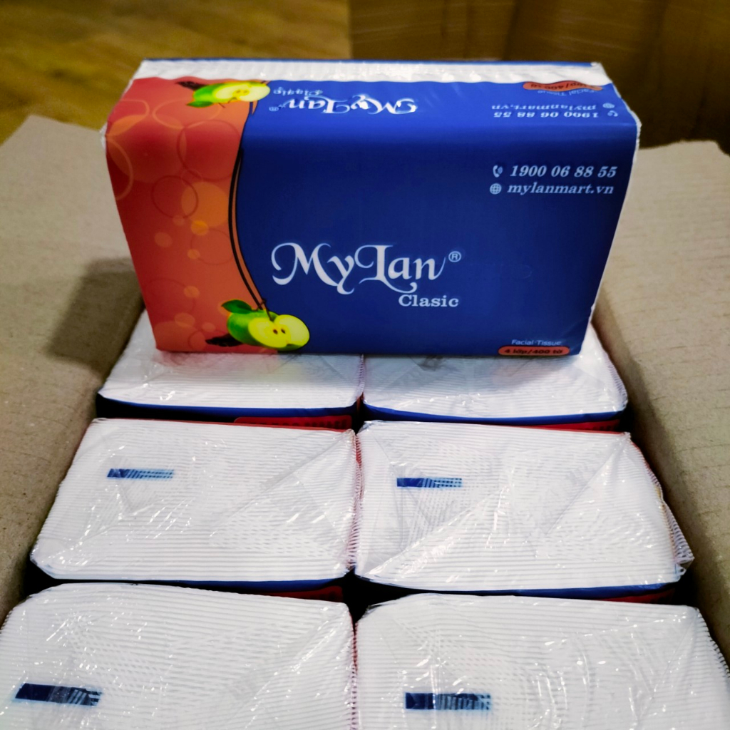 ( Hàng Mới ) Combo 5 Gói Khăn Giấy Rút Lụa Mylan Quả Táo Cao Cấp Siêu Dai và Mềm Mịn 400 Tờ ( 4 Lớp X 100 Tờ ) Kích Thước 1 Gói Khăn : Dài 155mm X Rộng 90mm X Cao 55mm Số Lượng: 400 Tờ ( 4 Lớp X 100 Tờ ) Kích Thước Giấy : 190mm X 155mm HSD: 5 năm kể từ ngày sản xuất