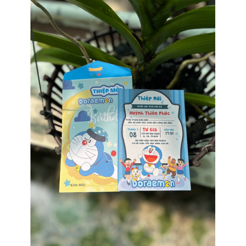 Combo 50 thiệp mời thôi nôi, sinh Nhật chú mèo Doraemon có tên bé