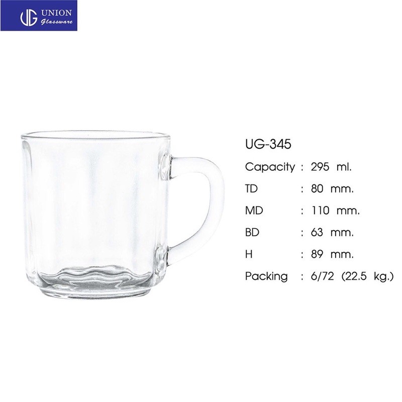Ly thủy tinh Thái có quai cầm UG345 Dáng ly có cạnh như hình cuối cùng, shop chụp Chất liệu: thủy tinh cao cấp Dung tích : 295 ml / ~11 Oz Đường kính miệng : 80 mm. Đường kính đáy : 63 mm. Cao: 89 mm. Hộp 6 cái , lưu ý sản phẩm không bao gồm khay! Bộ ly thủy tinh lù