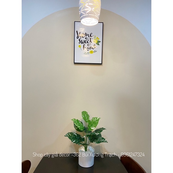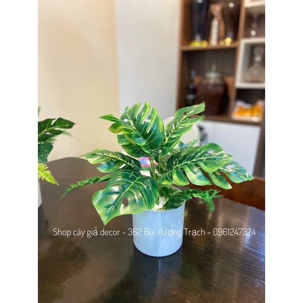 sp gồm 1 cây 35 - 40cm gồm 12 nhánh lá 1 chậu nhựa giả sứ loại cao cấp, đã làm sẵn xốp cắm, kích thước chậu 13x13cm sỏi phủ lên bề mặt chậu sp nhỏ xinh để kệ, bàn đều oki ạ. Cam kết ảnh thật shop tự chụp.