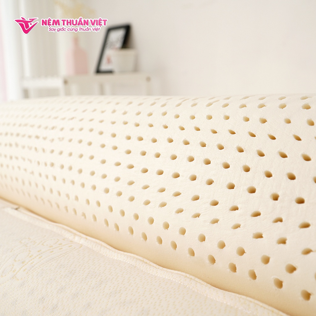 Cao su thiên nhiên Gối cao su Thuần Việt được làm từ cao su thiên nhiên đổ khuôn nguyên khối. Sản phẩm an toàn tuyệt đối cho mọi đối tượng sử dụng. Có khả năng tự phân huỷ, bảo vệ môi trường tốt. Thoáng mát khi nằm Ở cả 2 bề mặt gối có hàng trăm lỗ tròn nhỏ li ti, hơi nóng của cơ thể nhanh chóng thoát ra bên ngoài, không hầm bí khó chịu vùng đầu và cổ. Cũng giống nguyên tắc thoát hơi như ở nệm cao su, gối cao su Thuần Việt mang đến cảm giác mát mẻ trong mọi điều kiện thời tiết khác nhau. Kích thước tiêu chuẩn Gối có thiết kế hình lượn sóng có kích thước 40x60cm. Gối ôm trọn phần đầu và cổ. Chiều cao phù hợp cho nhiều đối tượng sử dụng. Gối ôm có kích thước 18x90cm, kích thước phù hợp với nhiều đối tượng. Độ đàn hồi hỗ trợ tối cho cơ thể khi nằm nghiêng. Kháng khuẩn và khử mùi Gối cao su Thuần Việt được sản xuất nhờ dây chuyền khép kín hiện đại. Nguyên liệu đã trải qua quá trình xử lý nên đảm bảo an toàn, không gây kích ứng da, không độc hại cho sức khoẻ về lâu về dài. Gối không có mùi hôi cao su thiên nhiên nên không gây cản trở giấc ngủ.