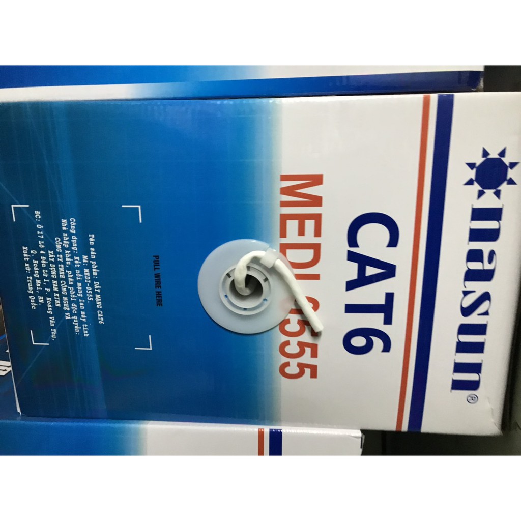 Dây mạng UTP Cat6 Nasun MEDI-0555 UTP CAT 6 NASUN MEDI-0555 Dùng trong mạng Lan Computer và Camera. - Nhãn hiệu: NASUN. Model: MEDI-0555. - Chiều dài: 305m/cuộn. Xuất xứ Trung Quốc