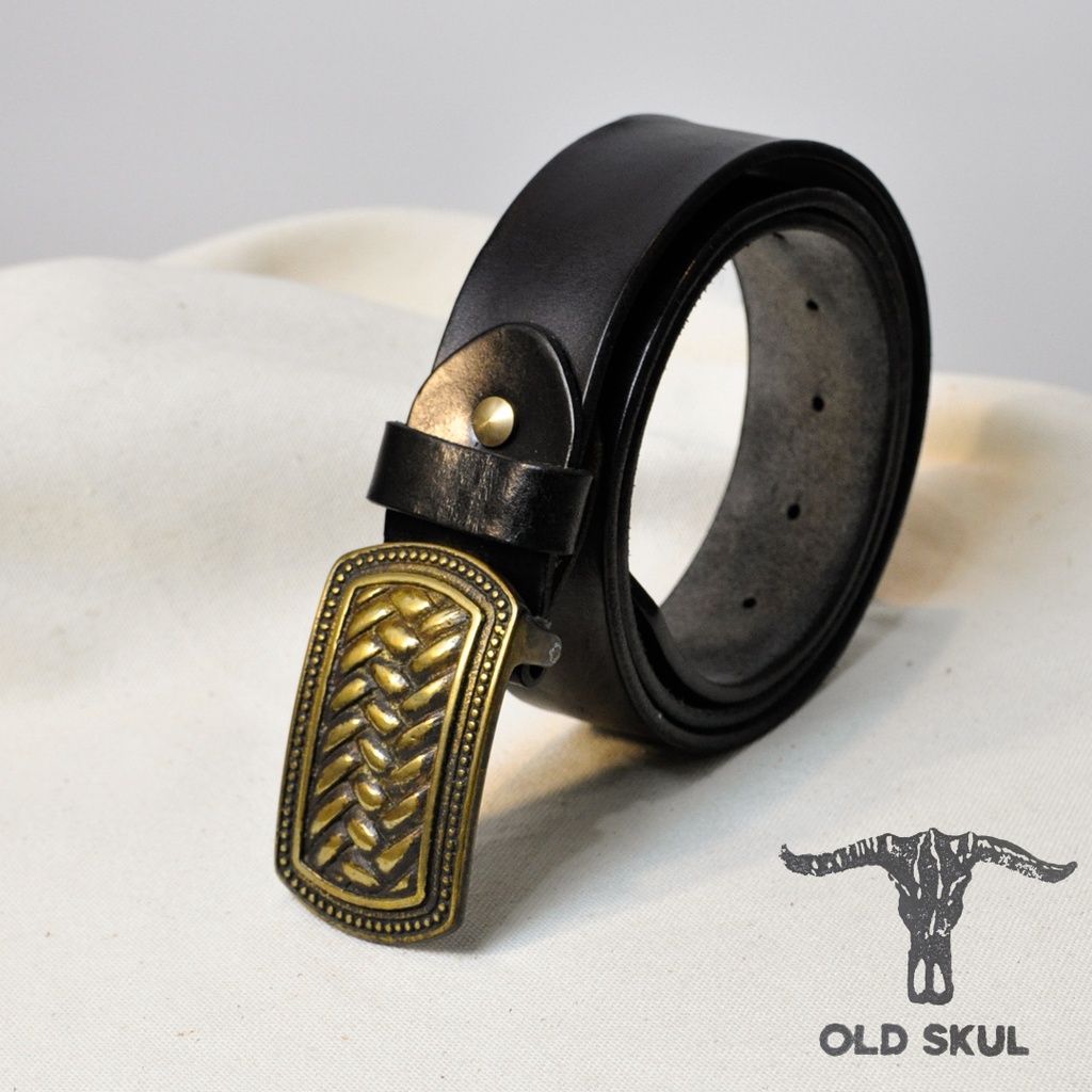 Dây thắt lưng quần bò da bò veg Ý khóa đồng thau đúc khối vintage, họa tiết La mã Old Skul DLOS03