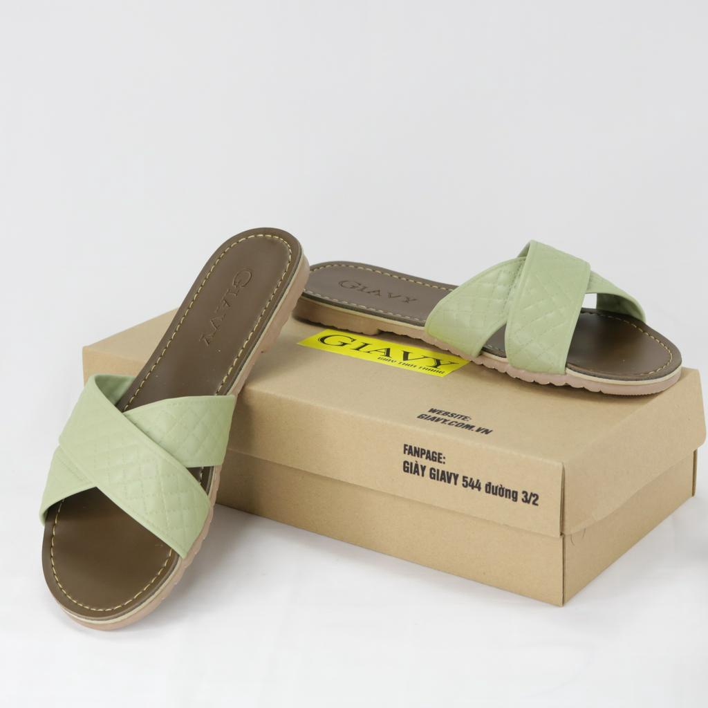 DÉP NỮ Thương hiệu độc quyền : GIAVY. Xuất xứ: Việt Nam. Mã sản phẩm: CHÉO DẬP Kiểu dáng: quai chéo dập nổi , đế bệt . Chất liệu quai : xi dầy. Đế cao su, có rãnh chống trơn trượt, keo dán chắc chắn bền bỉ. Màu sắc: Kem và Xanh đậu. Chiều cao: 1 cm. Kích cỡ : 35-36
