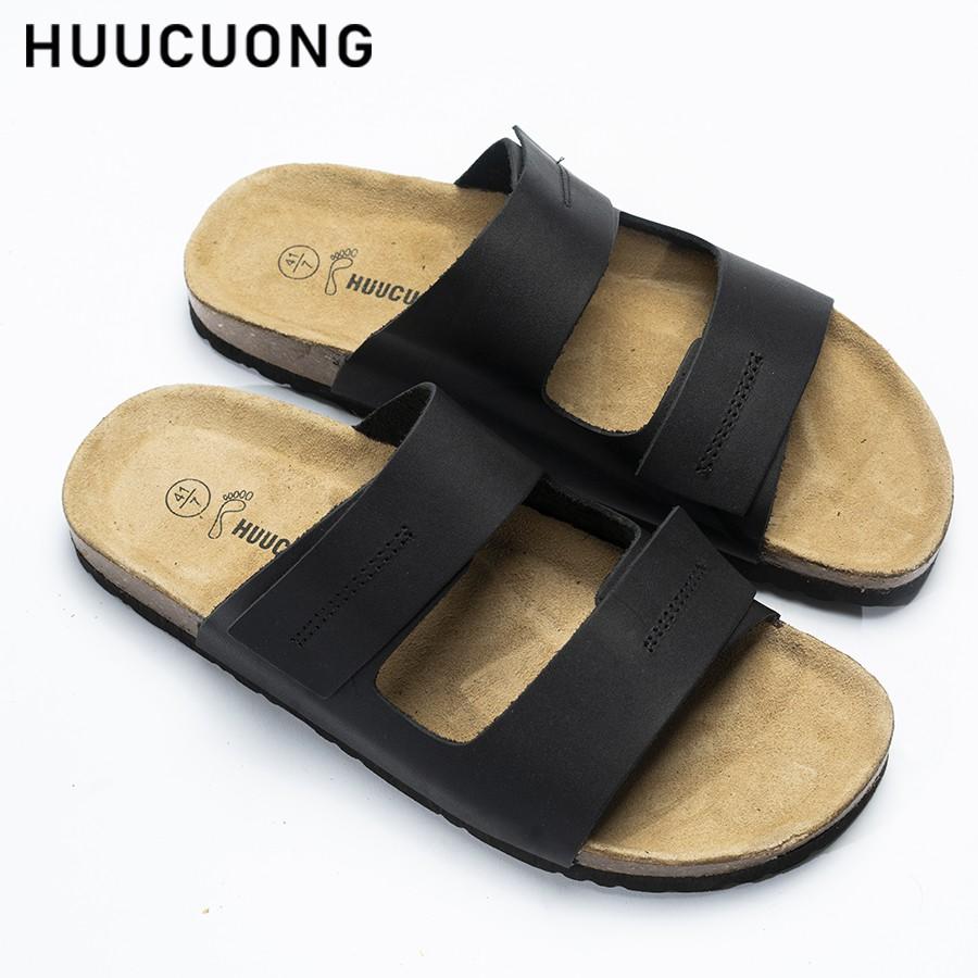 Dép Nam Huucuong dập chỉ da bò đen đế trấu handmade