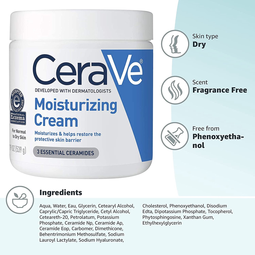 DƯỠNG ẪM CERAVE CREAM 562g DA THƯỜNG ĐẾN DA KHÔ & RẤT KHÔ DẠNG KEM KEM DƯỠNG ẨM CHỨA HYALURONIC ACID, CERAMIDE và công nghệ MVE duy trì dưỡng ẩm trong suốt 24 giờ liền. Chất kem giàu ẩm, mịn như nhung, thấm nhanh vào da cho làn da mềm mại, không dính bết. CERAMIDE