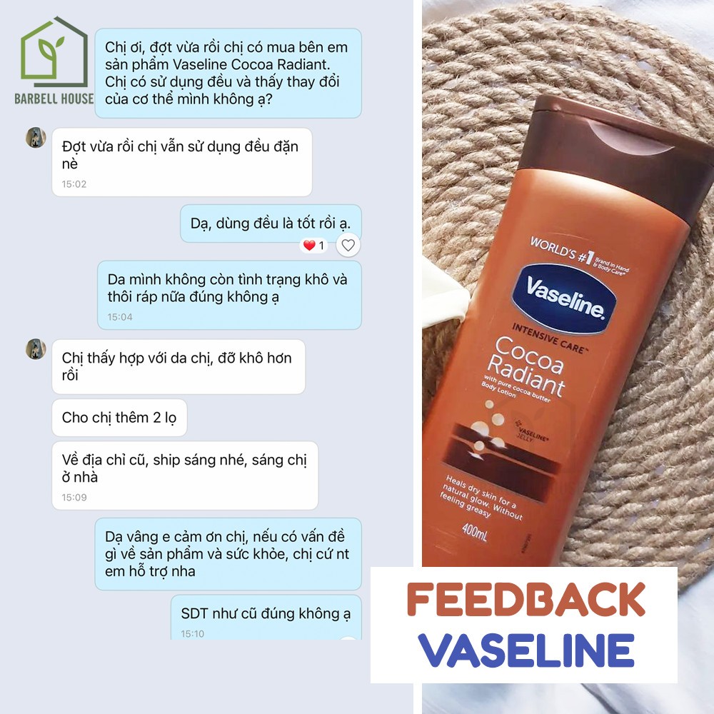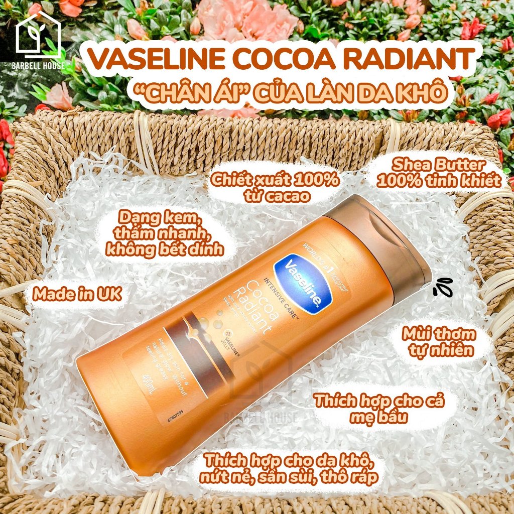 I. THƯƠNG HIỆU Vaseline - thương hiệu số 1 thế giới cho các sản phẩm chăm sóc da, đặc biệt là các sản phẩm dưỡng ẩm. II. THÔNG TIN SẢN PHẨM 1. Tên gọi: Vaseline Intensive Care Cocoa Radiant 2. Công dụng: - Chuyên dưỡng da body - Lotion dưỡng da Vaseline intensive care với tinh chất bơ được làm từ hạt cacao tinh khiết có mùi thơm dịu, giữ ẩm tốt cho làn da. Bạn có thể vừa sử dụng làm kem dưỡng da, vừa có thể là sáp chống nẻ vô cùng hiệu quả. - Thích hợp cho da khô, nứt nẻ, sần sùi, thô ráp hoặc do công việc phải làm ở phòng máy lạnh quá nhiều. Tinh chất bơ được làm từ hạt cacao tinh khiết bảo vệ cho làn da luôn mềm mại và mượt mà, dưỡng ẩm cho làn da khô cả ngày, làm mềm mịn làn da thô ráp, sần sùi, nhất là những vùng da thiếu nước, căng da khi mang thai. 3. Quy cách đóng gói: - Chai 400ml. - Thành phần và bao bì của sản phẩm có thể thay đổi ít nhiều tuỳ theo lô hàng nhập từ Hãng. 4. Thành phần: - Tinh chất bơ hạt mỡ, tinh chất cacao 5. Đối tượng sử dụng: - Mọi đối tượng. - Thích hợp cho cả mẹ bầu & sau sinh. - Không dùng có người dị ứng với bất kỳ thành phần nào của sản phẩm. 6. Hướng dẫn sử dụng & bảo quản - Lấy 1 lượng vừa đủ thoa đều các vùng da trên cơ thể sau khi tắm - Bảo quản: ở nhiệt độ dưới 30°C, thoáng mát, tránh ánh nắng và độ ẩm. 7. Thông tin liên hệ: - Địa chỉ: 585 Hoàng Hoa Thám, Ba Đình, Hà Nội - Hotline: 0947.88.2222 - 0247.308.6656 - Fanpage: https://www.facebook.com/barbellhouse.vn #vaseline #vaselinesensivecare #duongthe #duongdabody #kemduongbody #kemduongthe