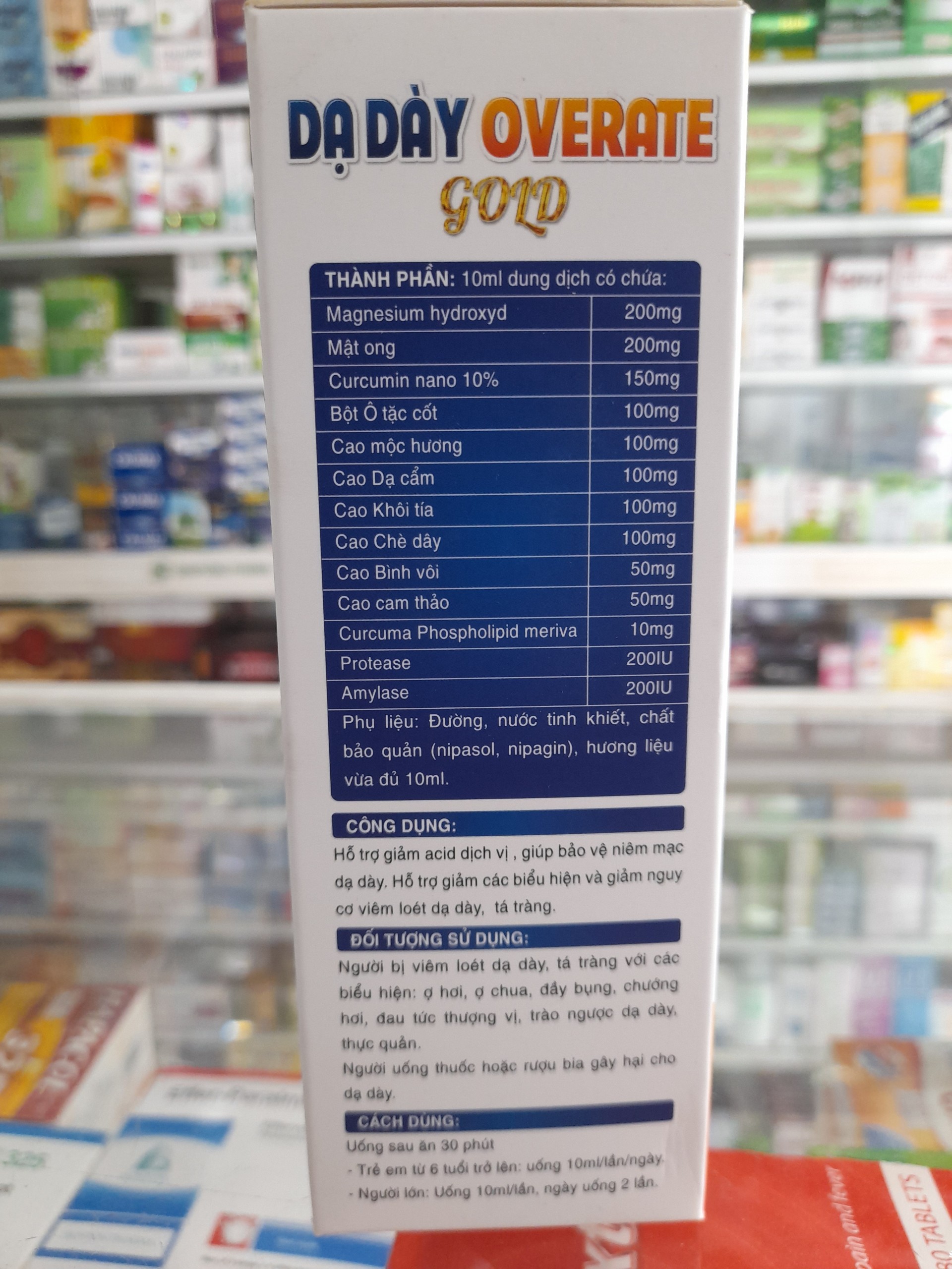 Dạ dày Overate Gold hỗ trợ giảm acid dịch vị, giúp bảo vệ niêm mạc dạ dày. Hỗ trợ giảm các biểu hiện và giảm nguy cơ viêm loét dạ dày, tá tràng. Những ai nên sử dụng Dạ dày Overate Gold Người bị viêm loét dạ dày, tá tràng với các biểu hiện: Ợ hơi, ợ chua, đầy bụng, chướng bụng. Đau tức thượng vị. Trào ngược dạ dày thực quản. Người thường xuyên dùng thuốc NSAID hay rượu bia gây hại cho dạ dày. Người có tiền sử viêm loét dạ dày, đạu dạ dày. Công dụng Dạ dày Overate Gold Hỗ trợ giảm acid dịch vị. Giúp bảo vệ niêm mạc dạ dày. Hỗ trợ giảm các biểu hiện và giảm nguy cơ viêm loét dạ dày, tá tràng. Cách dùng Dạ dày Overate Gold Sử dụng sau ăn 30 phút. Trẻ em từ 6 tuổi trở lên: uống 10ml/lần/ngày. Người lớn: Uống 10ml/lần, ngày uống 2 lần. Thành phần Dạ dày Overate Gold 10ml dung dịch có chứa: Magnesium hydroxyd: 200mg Mật ong: 200mg Curcumin nano 10%: 150mg Bột ô tặc cốt: 100mg Cao mộc hương: 100mg Cao dạ cẩm: 100mg Cao khôi tía: 100mg Cao chè dây: 100mg Cao bình vôi: 50mg Cao cam thảo: 50mg Curcuma Phospholipid meriva: 10mg Protease: 200IU Amylase: 200IU Thông tin sản phẩm Quy cách: Hộp 20 gói Bảo quản: Nơi khô ráo, thoáng mát, tránh ánh nắng chiếu trực tiếp. Nhà sản xuất: CÔNG TY CỔ PHẦN TẬP ĐOÀN DƯỢC – MỸ PHẨM VINPHARMAGiá sản phẩm trên Tiki đã bao gồm thuế theo luật hiện hành. Bên cạnh đó, tuỳ vào loại sản phẩm, hình thức và địa chỉ giao hàng mà có thể phát sinh thêm chi phí khác như phí vận chuyển, phụ phí hàng cồng kềnh, thuế nhập khẩu (đối với đơn hàng giao từ nước ngoài có giá trị trên 1 triệu đồng).....