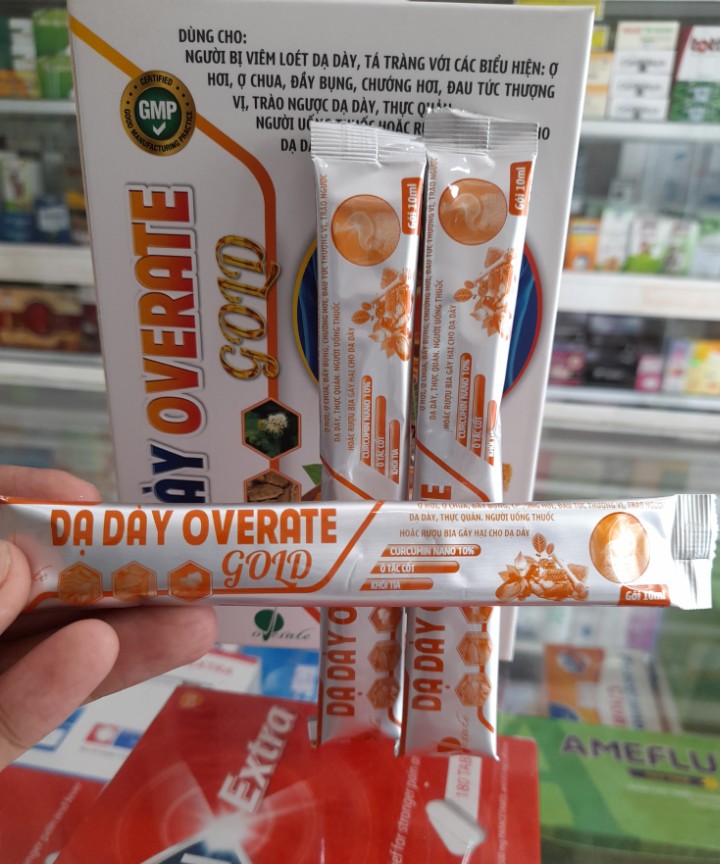 Dạ dày Overate Gold hỗ trợ giảm acid dịch vị, giúp bảo vệ niêm mạc dạ dày. Hỗ trợ giảm các biểu hiện và giảm nguy cơ viêm loét dạ dày, tá tràng. Những ai nên sử dụng Dạ dày Overate Gold Người bị viêm loét dạ dày, tá tràng với các biểu hiện: Ợ hơi, ợ chua, đầy bụng, chướng bụng. Đau tức thượng vị. Trào ngược dạ dày thực quản. Người thường xuyên dùng thuốc NSAID hay rượu bia gây hại cho dạ dày. Người có tiền sử viêm loét dạ dày, đạu dạ dày. Công dụng Dạ dày Overate Gold Hỗ trợ giảm acid dịch vị. Giúp bảo vệ niêm mạc dạ dày. Hỗ trợ giảm các biểu hiện và giảm nguy cơ viêm loét dạ dày, tá tràng. Cách dùng Dạ dày Overate Gold Sử dụng sau ăn 30 phút. Trẻ em từ 6 tuổi trở lên: uống 10ml/lần/ngày. Người lớn: Uống 10ml/lần, ngày uống 2 lần. Thành phần Dạ dày Overate Gold 10ml dung dịch có chứa: Magnesium hydroxyd: 200mg Mật ong: 200mg Curcumin nano 10%: 150mg Bột ô tặc cốt: 100mg Cao mộc hương: 100mg Cao dạ cẩm: 100mg Cao khôi tía: 100mg Cao chè dây: 100mg Cao bình vôi: 50mg Cao cam thảo: 50mg Curcuma Phospholipid meriva: 10mg Protease: 200IU Amylase: 200IU Thông tin sản phẩm Quy cách: Hộp 20 gói Bảo quản: Nơi khô ráo, thoáng mát, tránh ánh nắng chiếu trực tiếp. Nhà sản xuất: CÔNG TY CỔ PHẦN TẬP ĐOÀN DƯỢC – MỸ PHẨM VINPHARMAGiá sản phẩm trên Tiki đã bao gồm thuế theo luật hiện hành. Bên cạnh đó, tuỳ vào loại sản phẩm, hình thức và địa chỉ giao hàng mà có thể phát sinh thêm chi phí khác như phí vận chuyển, phụ phí hàng cồng kềnh, thuế nhập khẩu (đối với đơn hàng giao từ nước ngoài có giá trị trên 1 triệu đồng).....