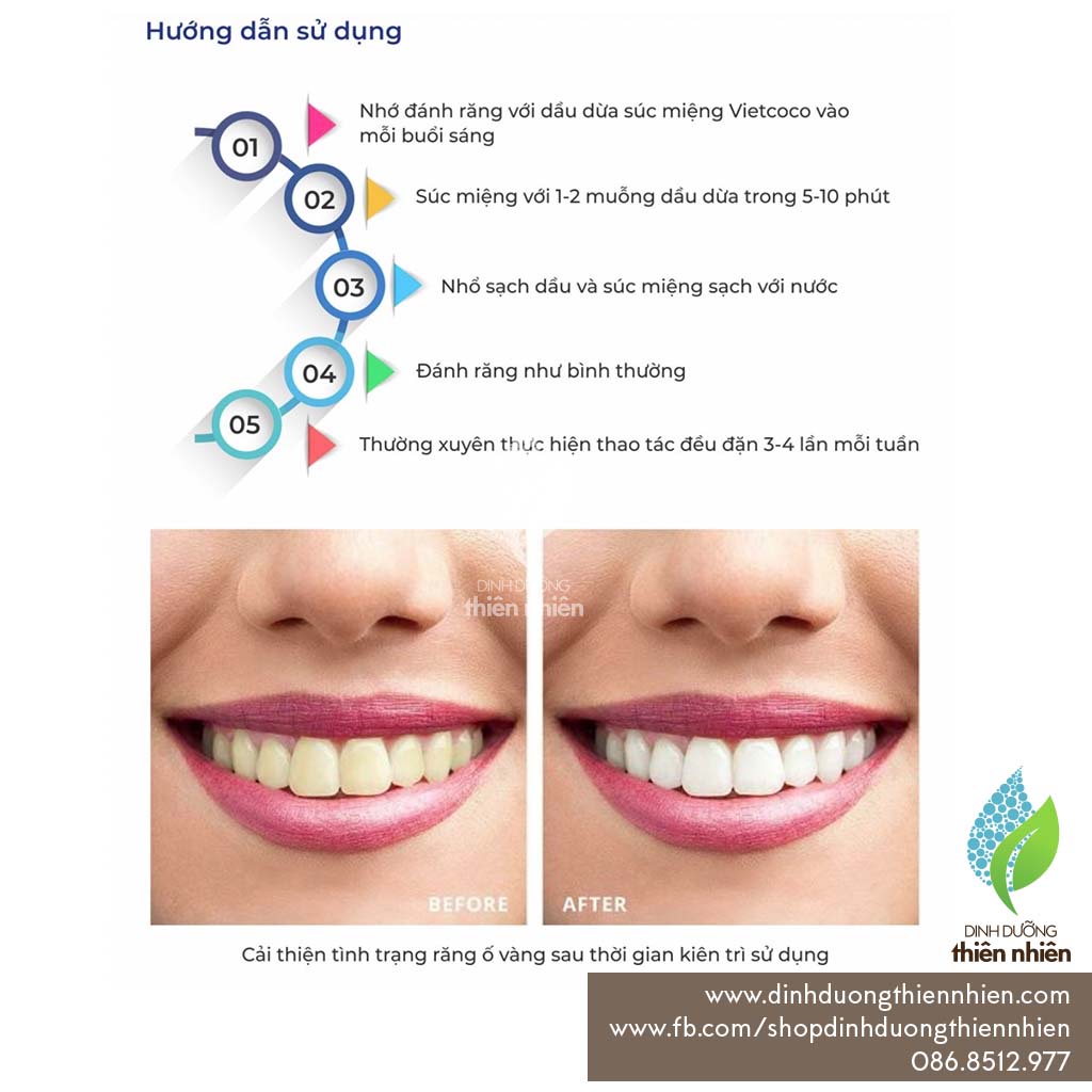 Dầu Dừa Súc Miệng VietCoCo Coconut Oil Pulling Mouthwash, 100% Natural, 225ml: - Hầu hết các loại nước súc miệng bán trên thị trường đều chứa cồn (ethanol) có thể gây ra cảm giác nóng rát ban đầu, mùi vị khá khó chịu và cảm giác khô miệng. Nước súc miệng dầu dừa Vietcoco không cồn có tác dụng tốt hơn đối với độ bóng, màu sắc, độ cứng và độ mòn của các vật liệu phục hình răng so với nước xúc miệng có chứa cồn và phù hợp cho những người có tiền sử lạm dụng rượu, người mắc chứng khô miệng. - Thành phần: 99% dầu dừa, 1%hương bạc hà. - Xuất xứ: Việt Nam. - 225ml/ chai. - Hạn sử dụng: 24 tháng. Nước súc miệng dầu dừa tốt cho răng miệng vì: 1. Ngừa vi khuẩn gây hại trong khoang miệng Axit lauric, một loại axit béo chuỗi trung bình, chiếm đến khoảng gần 50% chất béo chứa trong dầu dừa. Ngay khi cơ thể bạn hấp thu axit lauric sẽ phân hủy và chuyển hóa thành một hợp chất có tên là monolaurin. Cả axit lauric và monolaurin đều có khả năng ngừa vi khuẩn, nấm men và virus gây hại trong cơ thể. Theo nghiên cứu: Axit lauric chính là loại axit béo có hiệu quả trong việc ngừa các mầm bệnh này hơn so với bất kỳ loại axit béo bão hòa nào. Loại axit này có khả năng tấn công các vi khuẩn có hại sinh sống trong khoang miệng, tác nhân gây nên tình trạng sâu răng, viêm nướu và hơi thở có mùi. Do đó, axit lauric đặc biệt có tác dụng rất tốt trong việc giúp loại trừ các vi khuẩn khoang miệng có tên là streptococcus mutans, tác nhân hàng đầu gây nên chứng sâu răng. 2. Giảm tích tụ mảng bám để ngăn ngừa viêm nướu Bệnh viêm nướu, hay còn gọi là viêm lợi, là tình trạng chỉ sự sưng viêm bên trong nướu. Nguyên nhân chính gây nên bệnh này chính là sự tích tụ của các mảng bám trên bề mặt răng. Dầu dừa có khả năng làm giảm tình trạng tích tụ mảng bám trên răng, đồng thời chống lại bệnh viêm nướu. 3. Ngừa sâu răng hiệu quả Nước xúc miệng dầu dừa nguyên chất có thể tấn công các streptococcus mutan và lactobacillus, 2 nhóm vi khuẩn chính góp phần gây nên tình trạng sâu răng. Dầu dừa giúp làm giảm sự tồn tại của các vi khuẩn này. Vì vậy, nếu muốn ngừa sâu răng, hãy sử dụng nước xúc dầu dừa như một loại nước súc miệng hằng ngày để loại bỏ vi khuẩn CÁCH SỬ DỤNG NƯỚC SÚC MIỆNG DẦU DỪA VIETCOCO: - Súc miệng với 20ml nước súc miệng dầu dừa Vietcoco. - Súc đảo dầu khắp khoang miệng từ trong ra ngoài, trong vòng từ 2 – 5 phút hoặc daì hơn càng tốt. - Phun dầu dừa vào thùng rác thay vì bồn rửa mặt vì dầu dừa dễ đóng cứng lại gây tắc nghẽn. - Xúc miệng 02 lần/ngày. Sau khi súc miệng không được nuốt. Trong khi súc miệng bằng nước súc miệng dầu dừa, các axit béo chứa trong đó sẽ tấn công và hút ra các vi khuẩn trong khoang miệng, đồng thời tẩy sạch các mảng bám trên bề mặt răng. Do đó, tốt nh-ất nên súc miệng bằng nước súc miệng dầu dừa Vietcoco vào mỗi buổi sáng, trước khi dùng bữa hoặc uống nước.