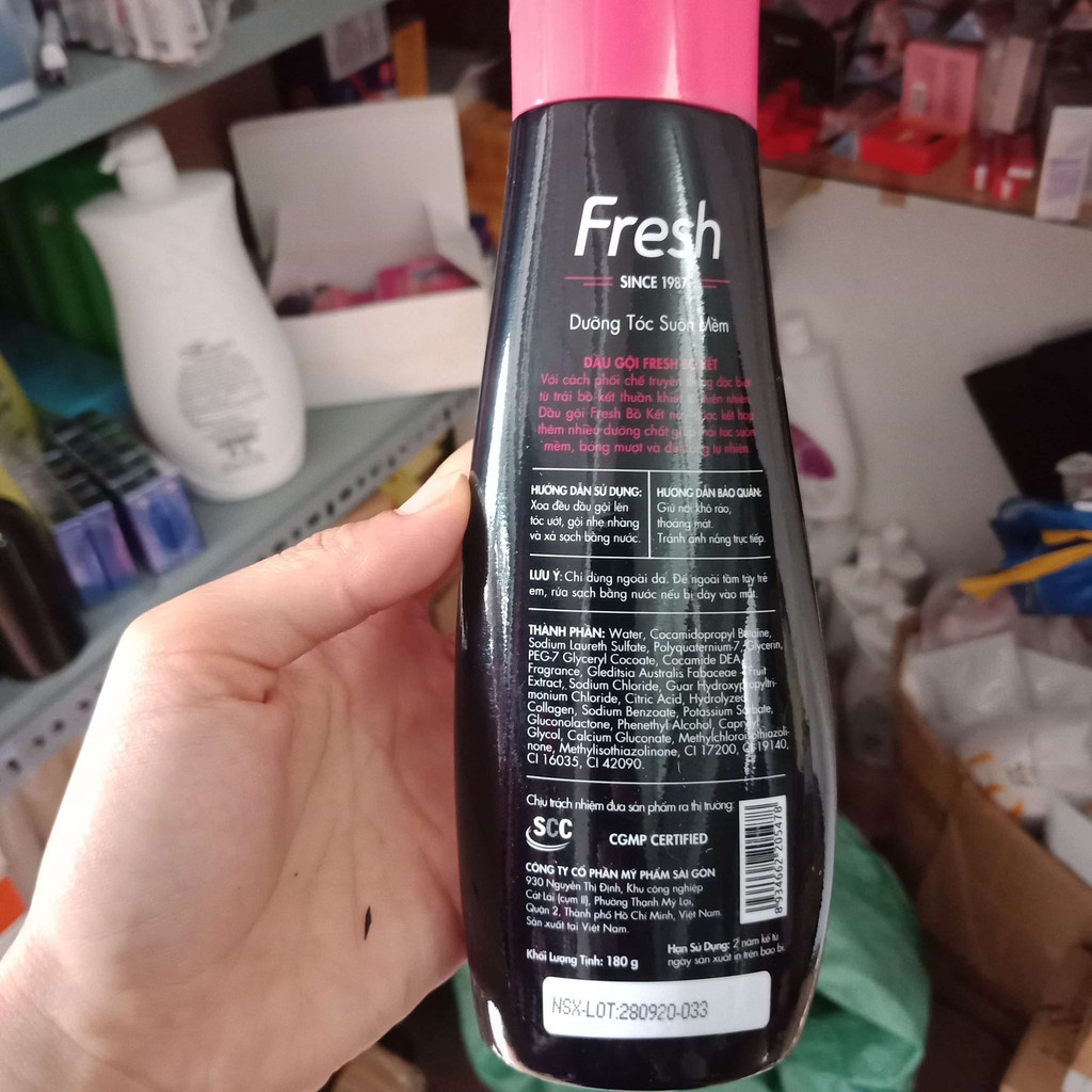 Dầu Gội Fresh Bồ Kết Collagen Dưỡng Tóc Suôn Mềm 180gram Sản xuất tại Việt Nam Công dụng Giúp tóc suôn mềm, bóng mượt và đen tự nhiên Thành phần Có chứa chiết xuất từ bồ kết thuần khiết và các hợp chất dưỡng ẩm Mùi hương Bồ kết HSD : date luôn mới Dầu gội Fresh ý trung nhân kết với phương pháp phối chế truyền thống đặc thù trong khoảng trái nhân tình kết trong sáng tự nhiên kết hợp thêm rộng rãi dưỡng chất giúp mái tóc suôn mềm bóng mượt và đen óng tự dưng xây dựng thương hiệu trong khoảng năm 1987 dầu gội Fresh người tình kết sở hữu cách phối chế truyền thống đặc thù từ trái nhân tình kết trong sáng trùng hợp Qua quá trình nghiên cứu và vững mạnh dầu gội Fresh Suôn Mềm Bóng Mượt được phối hợp thêm rộng rãi dưỡng chất giúp mái tóc suôn mềm bóng mượt và đen óng khi không Nay đã với mẫu mã chai mới tiên tiến nhân tiện dụng hơn Hướng dẫn tiêu dùng : Cho ướt tóc xoa dầu và gội nhẹ nhõm Xả sạch với nước dùng thêm dùng xả để mang kết quả phải chăng nhất Bảo quản nơi khô ráo thoáng mát tránh ánh nắng trực tiếp và nhiệt độ cao Sản phẩm do Saigon Cosmetics