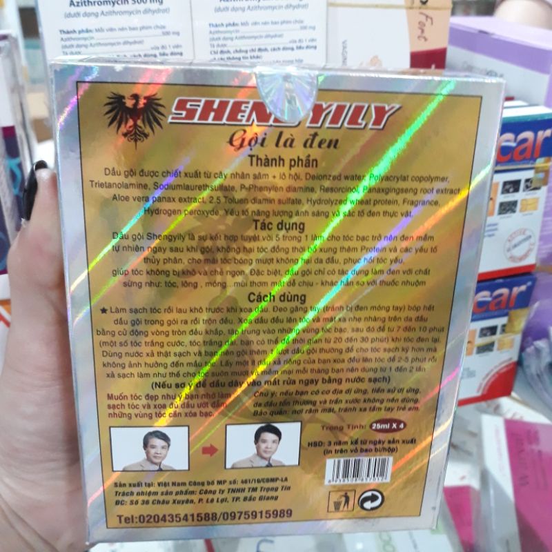 Dầu gội phủ bạc, nhuộm tóc, thảo dược Shampoo Is Black Sheng Yily 25ml 1. Nguyên nhân gây tóc bạc sớm Các nguyên nhân gây nên hiện tượng tóc bạc sớm như: - Yếu tố di truyền - Rối loạn nội tiết (tuyến sinh dục, thận yếu, giáp trạng - cường giáp hoặc thiểu giáp…) - Hút thuốc lá: theo thống kê những người hút thuốc lá thường dễ bị bạc tóc sớm gấp bốn lần so với những người không hút thuốc - Chế độ ăn uống không hợp lý chẳng hạn ăn quá nhiều thịt và đồ ngọt mà it ăn rau xanh, hoa quả hay uống nhiều rượu, bia, cà phê. Cơ thể thiếu đi các vitamin và khoáng chất thiết yếu, đặc biệt là 2 loại vitamin B và E. Có thể do mắc một số bệnh như bệnh thiếu máu ác tính (thường do thiếu vitamin B12 nên làm giảm việc sản sinh các sắc tố) hay hội chứng Werner (một bệnh bao gồm các triệu chứng lão hóa sớm vào độ tuổi 30). - Thường xuyên làm việc quá sức làm cơ thể mệt mỏi, suy nhược, căng thẳng, mất ngủ. - Tóc hư tổn do hóa chất: sử dụng quá nhiều thuốc nhuộm và các mỹ phẩm gây hại cho tóc. - Để tóc tiếp xúc với ánh nắng mặt trời trong thời gian dài. Tia cực tím từ ánh nắng mặt trời không chỉ ảnh hưởng tới da, nó còn hủy hoại lớp biểu bì trên tóc. 2. Giải pháp chữa tóc bạc Nhuộm tóc là cách thường hay áp dụng, đem lại hiệu quả tức thì. Tuy nhiên, thuốc nhuộm tóc là hóa chất và nếu nhuộm tóc từ một lần trở lên trong tháng khiến tăng nguy cơ ung thư bàng quang lên gấp 2 lần. Mặt khác thuốc nhuộm có chứa amoniac, chì… đem lại mùi khó chịu sau khi nhuộm đồng thời làm tăng nguy cơ ung thư máu. - Để có một mái tóc Đen tự nhiên, không lo lắng bởi các phản ứng phụ của thuốc nhuộm, đặc biệt tiết kiệm thời gian và tiền bạc, các nhà khoa học Pháp sử dụng công nghệ màng sinh lý tụ cho ra đời một sản phẩm dầu gội đen tóc SHENGYILY mới dành cho những người có mái tóc bạc, tóc mầu hoặc tóc bị hư tổn muốn chuyển thành tóc đen tự nhiên. - Shengyily được chiết xuất từ cây nhân sâm. Nhân sâm có thể hoạt hóa được lớp biểu bì của da làm giảm sự hóa sừng, giữ ẩm và làm mềm dịu da, làm tăng cường lưu thông máu dưới da do kích thích tuần hoàn máu, làm giảm nhăn da , giúp tóc mọc và làm trắng da. - Ngoài ra sản phẩm còn chứa lô hội (nha đam): nguồn dưỡng chất dồi dào gồm19 axit amin thiết yếu, vitamin nhóm B như B12, vitamin C, E & khoáng chất như sắt, canxi, lecithin, Magiê, Natri Kali, Mangan và kẽm. Lô hội có tính chất tương tự như chất làm se da, giúp làm thoáng nang lông, cân bằng độ pH và tăng độ ẩm cho tóc, từ đó khiến tóc dễ mọc và mọc nhanh hơn. Các minh chứng khoa học đã cho thấy rằng, lô hội có khả năng “bảo vệ” da, đặc biệt làn da nhạy cảm dưới tác động của các tia cực tím dưới ánh nắng mặt trời UVA và UVB (UVA và UVB là các tia cực tím cực kỳ độc hại, tiếp xúc nhiều có thể gây ung thư da). Chất nhầy trong gel (phần thịt) của lô hội có khả năng thấm ướt giúp phục hồi mái tóc hư tổn,tìm lại “sức sống” cho mái tóc xơ cứng, thô ráp và xuất hiện nhiều gàu do sử dụng mỹ phẩm.