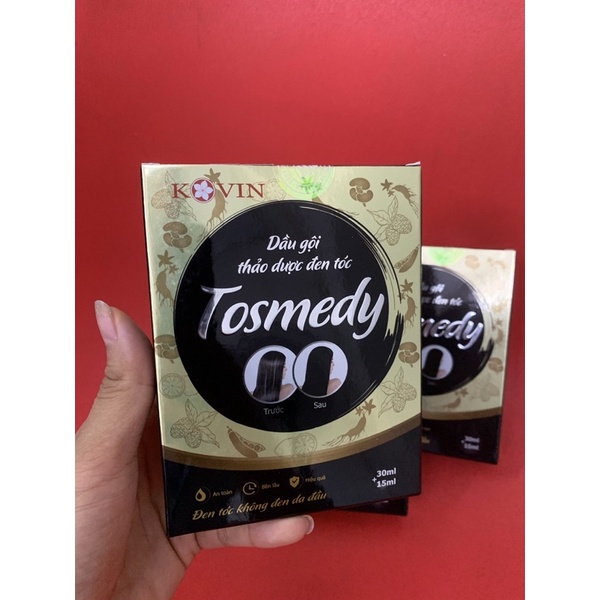 Dầu gội thảo dược đen tóc TOSMEDY, Dầu gội nhuộm tóc đen, nhuộm phủ bạc - dạng hộp 2 gói nhỏ 40ml - Gội là Đen, Hàng cao cấp Tosmedy ❆ CHI TIẾT SẢN PHẨM ✔ Chiết xuất 100% thiên nhiên từ 7 loại thảo dược như: nhân sâm, hà thủ ô, vừng đen, ngũ bội tử, trắc bách diệp.... ✔ Sản xuất trên dây chuyền đạt chuẩn GMP của Công Ty Dược Phẩm Trung Ương – MEDIPLANTEX. Sử dụng công nghệ chiết xuất tiên tiến, tạo nên sản phẩm vượt trội về chất lượng làm đen tóc ✔ Có 2 màu: đen + nâu (đều phủ bạc cực tốt) - Phù hợp cho mọi đối tượng. ------------------------------------------------------- ❉ CÔNG DỤNG: - Làm đen tóc bạc, tóc nhuộm... phục hồi tóc hư tổn cho mái tóc đen mượt tự nhiên. - Dưỡng và làm mềm tóc, ngăn ngừa rụng tóc. - Không làm hại da đầu, phục hồi tóc yếu, giúp tóc không bị khô và chẻ ngọn. - Độ bền màu: Giữ được màu lâu cho đến khi tóc mọc ra lớp mới - Đối tượng sử dụng: Dành cho mọi đối tượng… Người già tóc bạc, người trẻ muốn đổi màu tóc! -------------------------------------------------------- ❉ HƯỚNG DẪN SỬ DỤNG: (Đeo găng tay trước khi gội để tránh móng tay bị đen - khách yêu nhé) : #daugoi #daugoinhuomtoc #daugoithaoduoc #nhuomphubac #nhuomtocden #daugoichotocnhuom #daugoidentoc