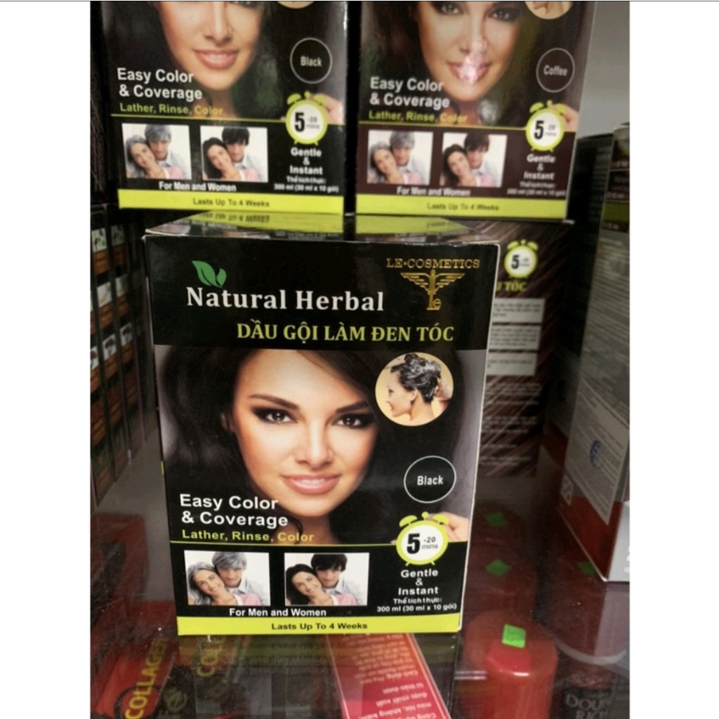 Sản phẩm làm từ thảo dược thiên nhiên, được sản xuất tại Việt Nam. Trên mỗi gói có trang bị gang tay ni lông. Sản phẩm có số công bố ,được đăng kí bảo hộ ở cục sở hữu trí tuệ. Cách dùng: Ghi trên bao mỗi gói. Mỗi lần chỉ dùng 1 gói(tóc ít) và dùng 2 gói (tóc dài nhiều) Sản phẩm dầu gội Natural Herbal( đen và nâu) - Giải pháp mới thay thế cho thuốc nhuộm, hãy sử dụng dầu gội Natural Herbal, bạn sẽ cảm nhận rõ những điều sau đây: - Tóc bạc không cần nhuộm, chỉ cần gội là (nâu,đen)không độc hại, mùi thảo dược, dùng như dầu gội đầu thông thường. - Có gói rất tiện lợi trong việc bảo quản. - Như dầu gội, mùi thơm dễ chịu không hôi và không dính da đầu như thuốc nhuộm. - Được chiết xuất từ hơn 20 loại dược thảo quý hiếm giúp tóc đen mượt, chắc khỏe như tự nhiên ngay lần đầu tiên sử dụng: Hà Thủ Ô, Nhân Sâm, Linh Chi, Tô Mộc, Ngũ Bồi Tử, Tạng Hồng Hoa, Mạc Hoa Liên…….. - Tiết kiệm thời gian có thể tự gội đầu cho bản thân mà không cần mất hàng giờ đến tiệm để nhuộm (8 => 15 phút). - Tuy nhiên nên để từ 25 đến 30 phút để giữ màu tóc lâu bạc hơn - Giữ màu được khoảng 5 đến 6 tuần Hạn sử dụng :3 năm kể từ ngày sản xuất