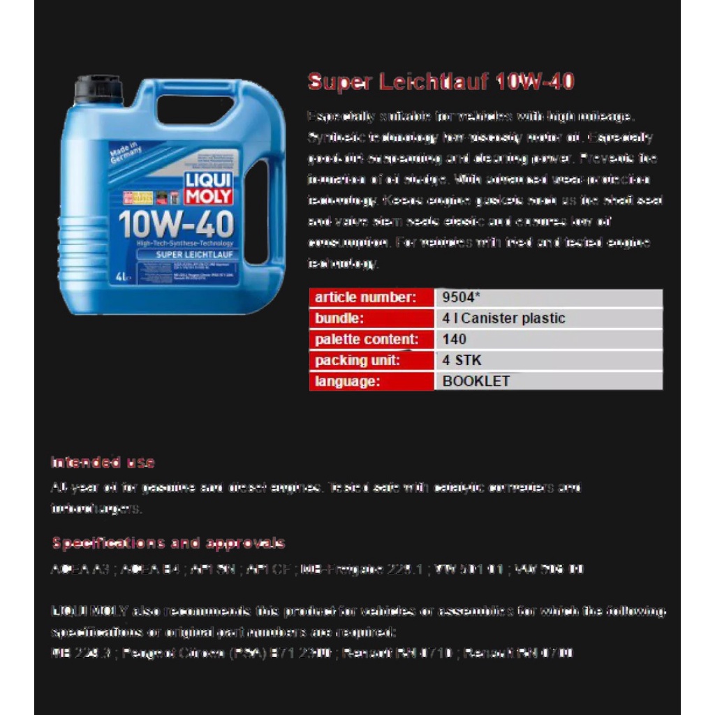 Liqui Super leichlauf 10W40 mang những đặc tính cao cấp nhất của loại sản phẩm nhớt dành cho xe ô tô cao cấp và xe tay ga hiện đại. Liqui Super leichlauf 10W40 là dầu tổng hợp công nghệ cao. Được phát triển cho động cơ làm việc hiệu xuất cao đòi hỏi loại nhớt có độ
