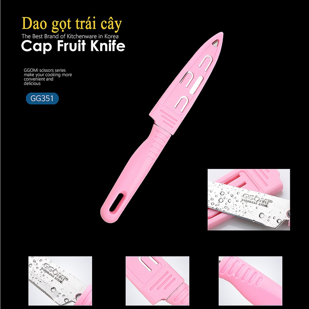 Dao gọt trái cây màu hồng có nắp bảo vệ dài 20.5cm, lưỡi dài 10.5cm, thép không gì GGOMi Hàn Quốc GG351